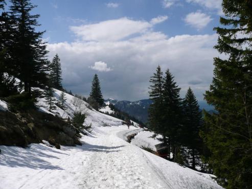 Vom Parkplatz führte uns der Weg nach links und dann geradeaus Richtung Kampenwand. An einer Weggabelung folgten wir dem Wegweiser "Steinlingalm". Teilweise ging es auf Wanderwegen und Forststraßen nach oben. Nach ca. 1 Stunde hatten wir schon einen schönen Ausblick auf die Wand. Es lag noch einiges an Schnee.