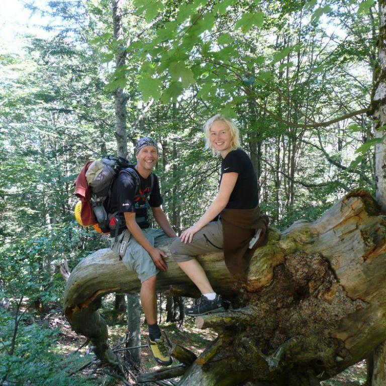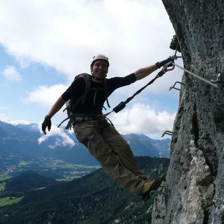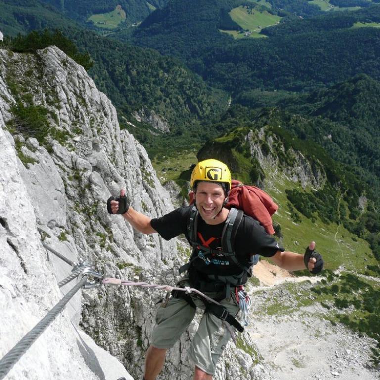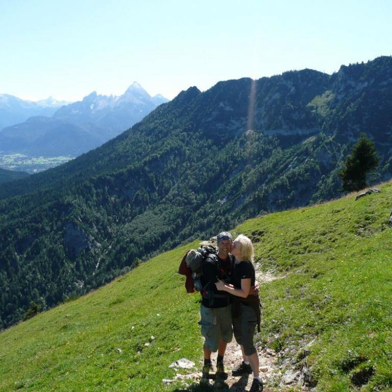 Brigitte, Wolfgang und ich waren schon um halb 6 "On Tour". Zuerst mit dem Auto Richtung Salzburg nach Marktschellenberg. In Ettenberg parkten wir unser Auto und los gings mit Rucksack und Klettersteigset bewaffnet auf dem Forstweg bis zum Almgebiet Scheibenkaser. Hier schien herrlich die Sonne und 20 Minuten später standen wir auch schon am Einstieg des Klettersteiges. Die Ausrüstung angelegt und hinein in den Steig. Es ging gleich mit einer saftigen C-Stelle los. Immer weiter hangelten wir uns die Stahlseile nach oben. Der Steig machte uns sehr viel Spaß. In luftiger Höhe gab es immer wieder super Fotoshots mit Blick auf den Watzmann in Wolken. Nach knapp 2 Stunden im Steig erreichten wir den Gipfel des Berchtesgadner Hochthrons. Wir hatten eine herrliche Aussicht auf die umliegenden Berge und das Wetter war sehr sonnig. Durch den gestrigen Temperatursturz lag sogar ein wenig Schnee auf dem Gipfel und das im August. Wir wanderten dann zum Störhaus wo es eine Brotzeit mit Weißbier gab. Über das unbeschilderte, teilweise Stahlseil gesicherte Mittagsloch stiegen wir ab, da der Normalweg gesperrt war. Dort hatte es einen Todesfall durch Herzinfarkt gegeben und ein Hubschrauber musste erst das Opfer bergen. Der Abstieg gestaltete sich nicht so einfach, da teilweise Kletterstellen dabei waren und auch immer wieder Steine von oben losgetreten wurden. Um ca. 15 Uhr erreichten wir wieder die Scheibenkaseralm, wo wir wieder auf dem Aufstiegsweg abstiegen.