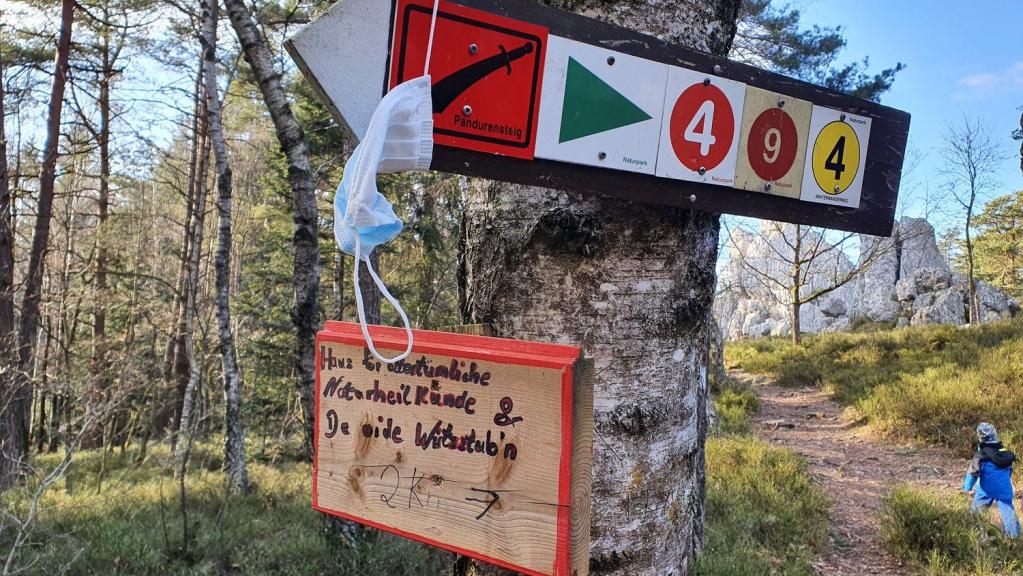 Die Felsen werden niedriger und verschwinden nach und nach unter der Erde. Kurz darauf gelangt man an den Waldrand. Das Hinweisschild "Country-Restaurant Nashvilla 10 Minuten Fußweg" zeigt nach Norden. Kurz vor dem Restaurant biegt der Wanderweg Nr. 9 nach rechts in den Wald ab und es geht wieder in Richtung Ausgangspunkt zurück.