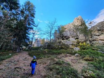 Zuerst wandert man ein Stück durch den Wald, bis man auf eine Freifläche gelangt, wo man rechts die ersten Quarzfelsen bestaunen kann. Eine weitere Infotafel beschreibt die Pflanzen und Tiere am Felsen, wie Eidechsen, Schlangen und Fledermäuse. Brotzeitbänke laden zum Verweilen in der Sonne ein.