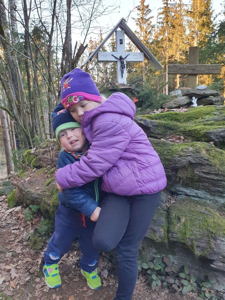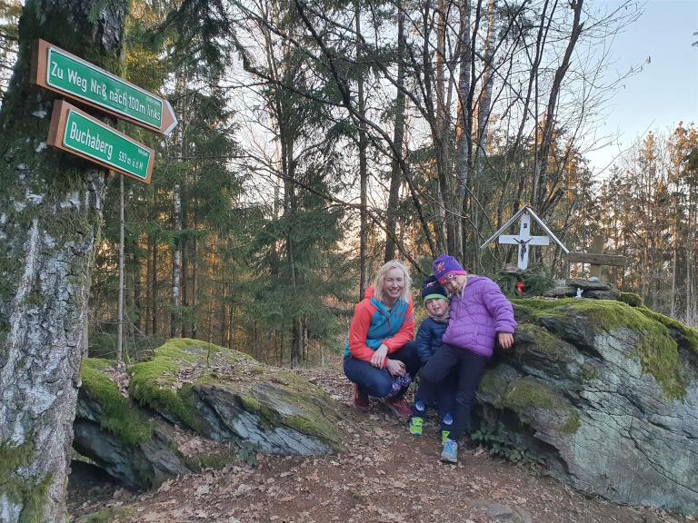 Oberhalb der Wallfahrtskirche Hl. Kreuz bei Windberg parkten wir unser Auto an einem Forstweg auf der linken Seite. Der Weg ist mit "Buchaberg" beschildert. Zuerst geht es etwas nach oben und wir konnten unseren ersten Geocache einsammeln. Ein kleiner Pfad führte uns dann links um den Buchaberg. Hier gibt es einen kleinen Abzweiger nach oben bis zum Gipfelfelsen, der mitten in den Bäumen liegt. Zwei kleine Gipfelkreuz zieren den 593 m hohen Buchaberggipfel. Wir wanderten über den Gipfel und in Richtung Auto weiter. An einer freien Wiese machten wir es uns bequem um die letzten Sonnenstrahlen bei einer deftigen Brotzeit und Radler zu genießen. Hier gibt es eine schöne Bank (Geocache Nr. 2) zum verweilen, die leider belegt war, aber auch der trockene Wiesenboden war bequem. Über die Straße wanderten wir zurück zum Auto, da es nach dem Sonnenuntergang sehr schnell frisch wurde. Bei der Wallfahrtskirche suchten wir zum Abschluss unseren 100. Geocache :-)