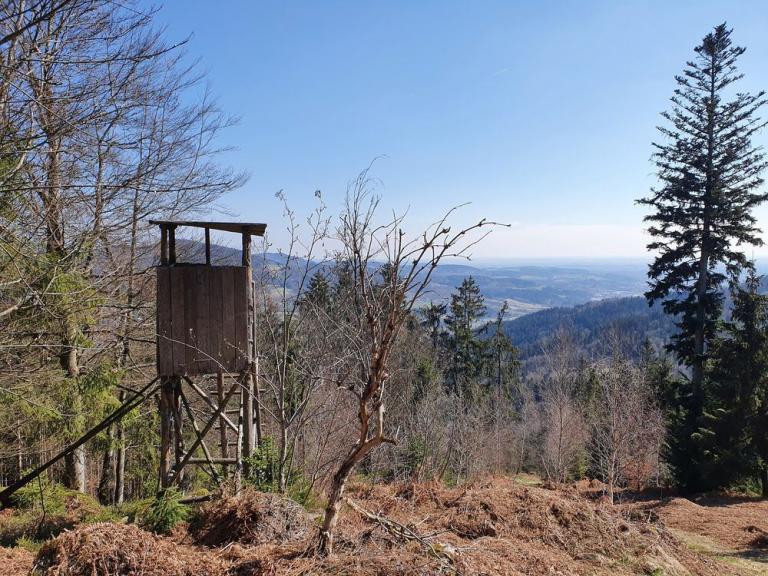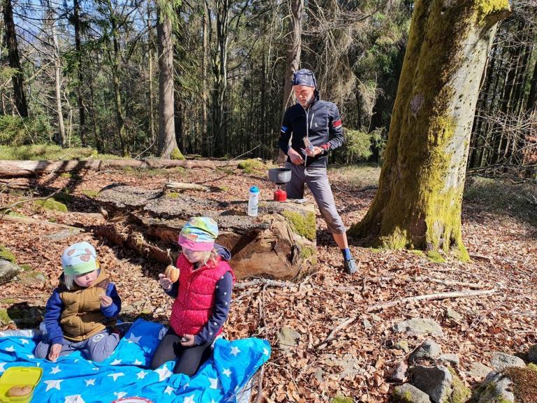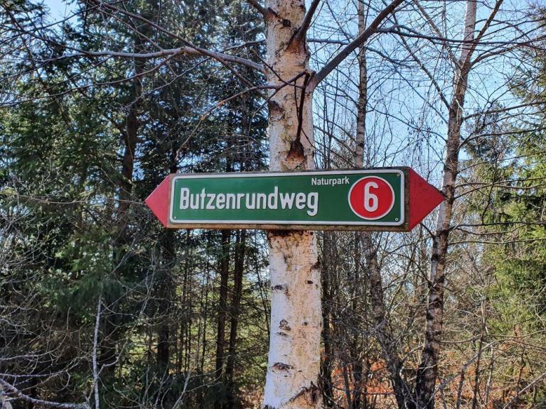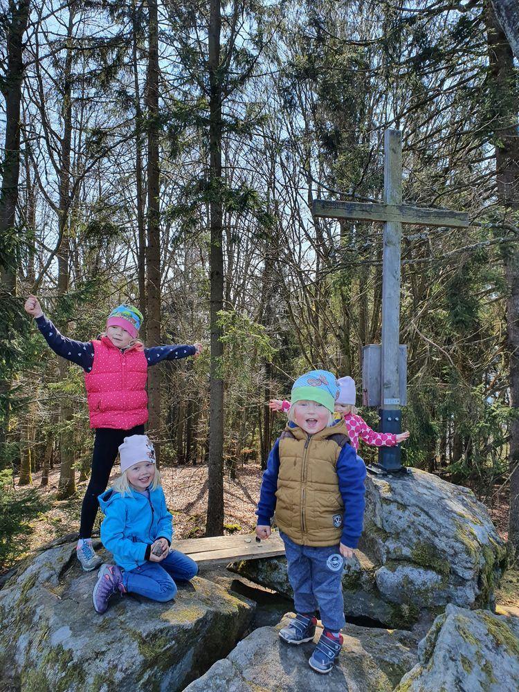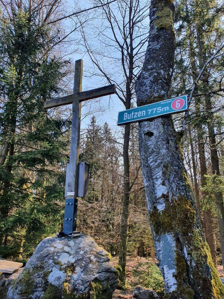 Langsam werden die kindgerechten, leichten Gipfelziele im Bayerischen Wald weniger. Dieses Mal fand ich einen etwas unbekannteren Gipfel, den Butzen (775 m), im Landkreis Deggendorf. Dieser liegt in der Nähe von Edenstetten und dem Schloss Egg. Auch die Suche nach dem Startpunkt gestaltete sich nicht so einfach, aber wir fanden oberhalb Hauptmannsgrub bei dem Weiler "Faßlehen" eine Parkmöglichkeit in der Wiese (Siehe Anfahrtsbeschreibung). Zuerst wanderten wir weglos über die Wiese nach Osten bis zum Waldanfang. Hier fanden wir einen Wanderweg mit der Nummer 6 und 5b. Diesem folgten wir ein paar hundert Meter leicht bergauf, bis wir eine weitere Wiese erreichten. Direkt vor uns lag ein Hof und ein weiteres Waldstück. Leider gibt es keinen Pfad über die Wiese, somit wanderten wir weglos bis zum vor uns liegenden Waldstück. Direkt hinter einer steinigen Abgrenzung über die wir klettern mussten fanden wir wieder den Wanderweg 6 und 5b. Auf diesem ging es dann etwas steiler bergauf in Richtung Butzengipfel. Die Kinder fanden viele interessante Dinge zu erforschen: Ameisenhügel, Stockpilze und viele Krabbeltiere unter Steinen und Ästen. Wir hielten uns dann links auf dem Butzenrundweg bis wir zu einem kaum leserlichen Schild mit der Aufschrift "Butzenkreuz" gelangten. Ab hier ging es einen sehr steilen Forstweg nach oben bis zu einer Freifläche direkt unterhalb des Gipfels. Nach ein paar weiteren Metern erreichten wir das kleine Gipfelkreuz des Butzen. Von hier hatten wir eine herrliche Aussicht auf den gegenüberliegenden Vogelsang und Rauhen Kulm. Wir machten es uns auf einer Picknickdecke in der Sonne bequem und kochten Kartoffelbrei mit dem Gaskocher :-) Als Highlight suchten wir mit den Kindern eine Geocache, den wir auch schnell fanden. Zurück zum Auto wollten wir einen anderen Weg gehen. Laut meiner App gibt es hinter dem Gipfel einen kleinen Pfad, den wir nicht wirklich fanden. Wir kämpften uns deshalb weglos nach unten, bis wir nach ein paar hundert Metern unterhalb des Gipfels auf den Butzenrundweg trafen. Diesem folgten wir ziemlich steil einen Forstweg nach unten. Teilweise hatten wir eine herrliche Aussicht auf die Ortschaft Grafling und dem Geißkopf im Osten. Der Weg gabelt sich ca. 150 Höhenmeter unter dem Gipfel und wir hielten uns westwärts. Wir blieben auf dem Butzenrundweg und mussten nochmals ziemlich steil zu einem einsamen Bergbauernhof aufsteigen. Diesen ließen wir linkerhand liegen und gelangten wieder auf den Aufstiegsweg unterhalb des Gipfels. Auf diesem wanderten wir zurück zum Auto. Insgesamt waren wir 5,2 Kilometer mit 300 Höhenmetern in 2 1/2 Stunden unterwegs. Die Geschwindigkeit mit Kindern ist natürlich erheblich langsamer, da es viel zu Entdecken gibt :-)