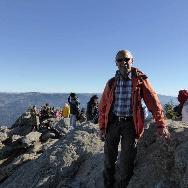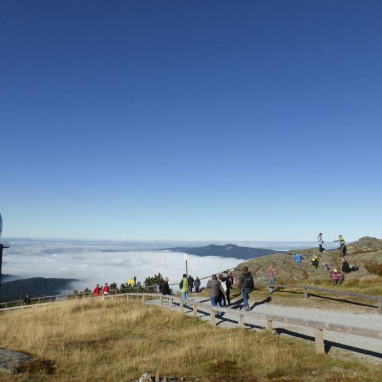 Info: Der Große Arber ist mit 1455,5 m ü. dem Meer der höchste Berg des Bayerischen Waldes und von Niederbayern. Außerdem stellt ein Felsriegel westlich vom Gipfelkreuz mit 1439,6 m Höhe den höchsten Punkt der Oberpfalz dar. Der in den Landkreisen Cham und Regen gelegene Berg wird daher auch als "König des Bayerischen Waldes" bezeichnet. Seine Gipfelregion besteht aus Paragneis.