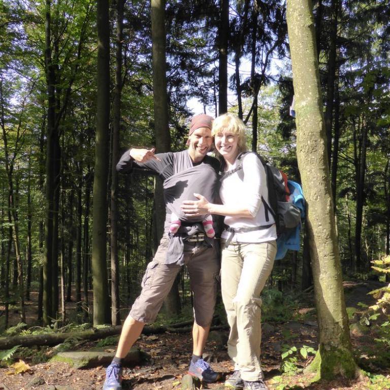 Emma wollte an die frische Luft und das ist mit ihren Eltern natürlich kein Problem. Wetter sollte passen, also sind wir drei schon früh nach Neukirchen beim Hl. Blut zur Talstation der Hohenbogenbergbahn. Natürlich kam für uns die Bahn nicht in Frage und somit kam Emma in das Tragetuch und ab ging es wandertechnisch in Richtung Diensthütte Hohenbogen. Über eine Forststraße erklommen wir die Höhenmeter. Die frische Luft und der Wald tat richtig gut. Brigitte war froh nach der Schwangerschaft langsam zu alten Kräften zu kommen und dadurch auch wieder besser die Natur genießen zu können. Nach 1 1/2 Stunden erreichten wir die Diensthütte Hohenbogen, wo wir unsere Kleine und auch uns fütterten. Von hier führte uns ein Pfad zu den ehemaligen Nato Türmen auf 1079 m und dann weiter zur Bergstation. Von hier stiegen wir über das Haus Schönblick und über die Skipiste wieder ab zur Talstation und zum Parkplatz. Insgesamt waren wir 4 Stunden incl. 1 Stunde Einkehr unterwegs.