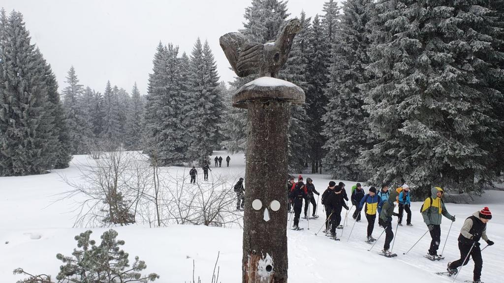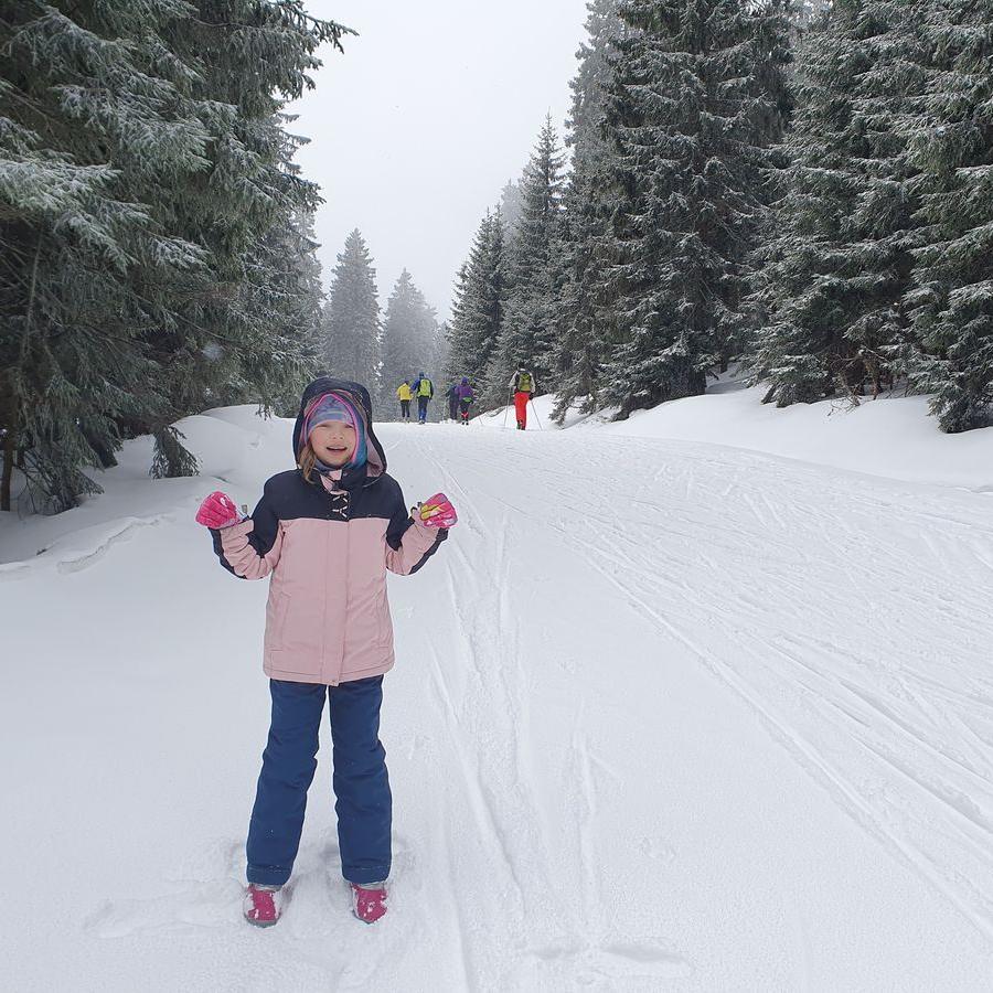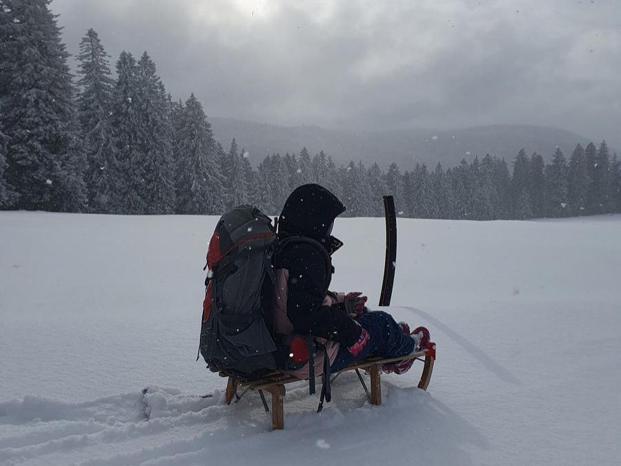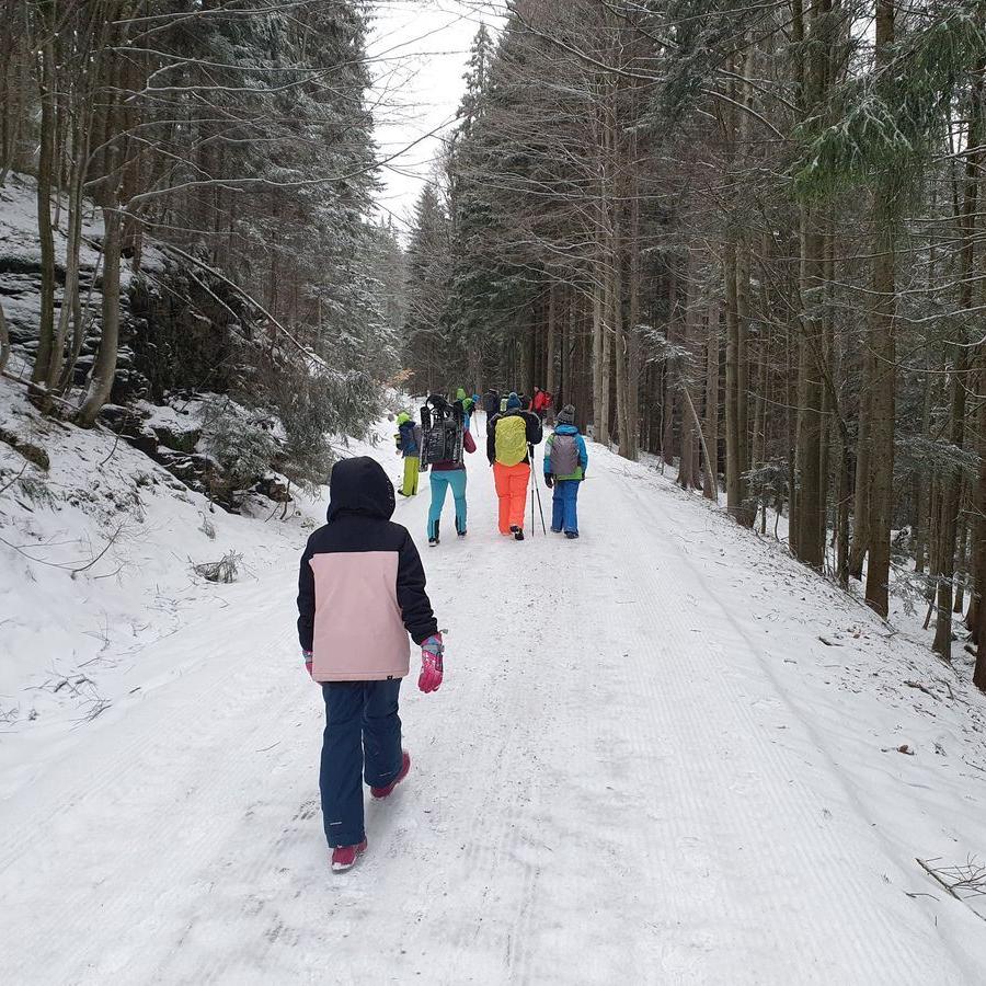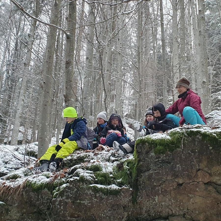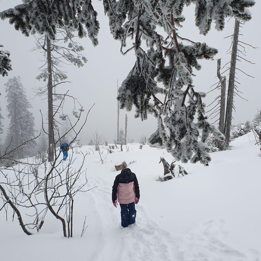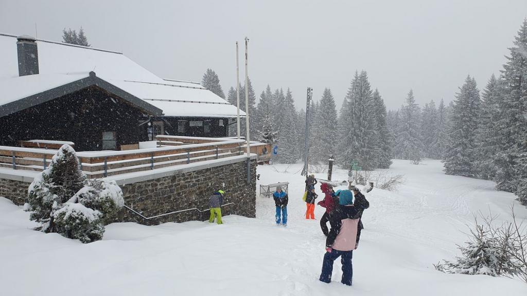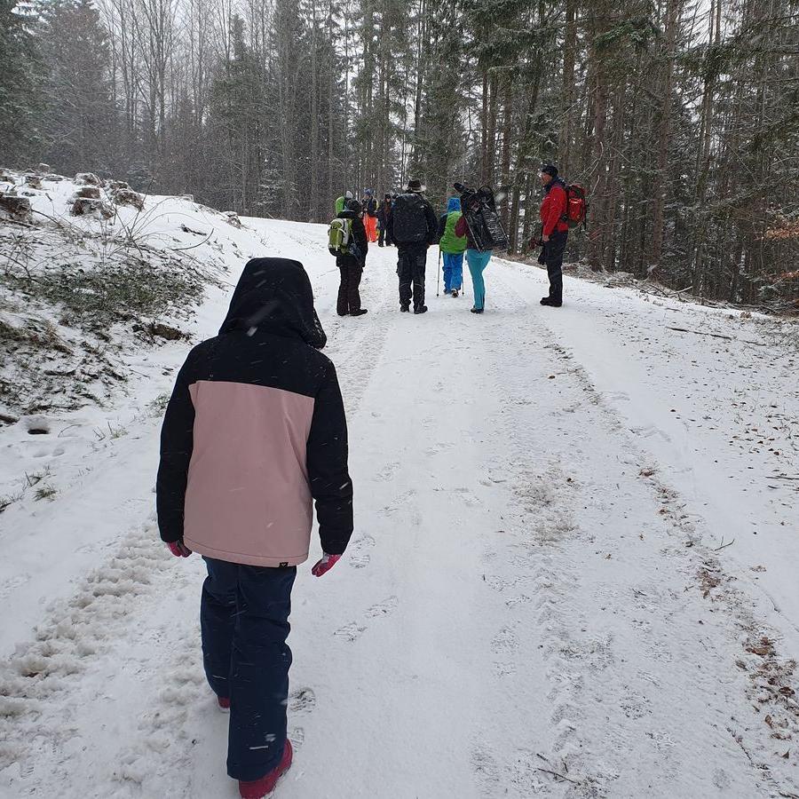 Geplant war eine Ski- Schneeschuh- oder Schlittentour für Kinder ohne, oder mit Übernachtung auf der Chamer Hütte (1289 m). Leider mussten viele krankheitsbedingt absagen. Auch die Winkls waren ebenfalls nur zur Hälfte vertreten, weil Timi sich am Morgen nicht fit fühlte. Emma und ich trafen uns am Parkplatz Klause mit den anderen Familien. Pünktlich bei Ankunft fing es stark zu schneien an. Unbeeindruckt von Schnee und Wind marschierten wir, mit unseren Schlitten am Rucksack befestigt, über die Tourenabfahrt (Chamer Hüttenweg) nach oben. Die Kinder fanden immer wieder Felsen zum Erklettern. Je höher wir kamen, desto tiefer wurde der Schnee. Perfekt für tolle Schneeengel und Sprünge in den weichen Schnee. Beim Buchhüttenschachten wurde es etwas steiler und der kalte Ostwind blies uns ins Gesicht. Die letzten beiden Kilometer stapften wir neben der Auerhahnloipe bis zur gut besuchten Chamer Hütte. Insgesamt waren wir 3 Stunden auf 7 Kilometer und 600 Höhenmeter unterwegs. Wir bezogen unsere gemütlichen Zimmer und stärkten uns in der warmen Gaststube. Nach etwas Ruhepause auf dem Zimmer, kämpften wir uns noch vor dem Abendessen durch den tiefen Schnee auf den Kleinen Arber mit seinen 1384 m. Hier hatte Miriam einen leckeren Gipfelschnaps für uns parat. Die Kinder kletterten an den vereisten Felsen des höchsten Berges der Oberpfalz und auch eine Schneeballschlacht durfte nicht fehlen. Am Abend genossen wir einen geselligen Hüttenabend mit Kartenspiel, Musik und vielen Abenteuergeschichten.