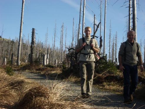 Abstieg: Danach geht es durch einen ziemlich stark beschädigten Bergfichtenwald (Windbruch / Borkenkäfer) bis zur Wegkreuzung "Schutzhütte Böhmweg". Von dort über das Teufelsloch (Felsschlucht) zur Martinsklause. Von der Martinsklause dann je bis nach Ausgangspunkt zum Parkplatz Fredenbrücke oder zum Parkplatz in Waldhäuser.
