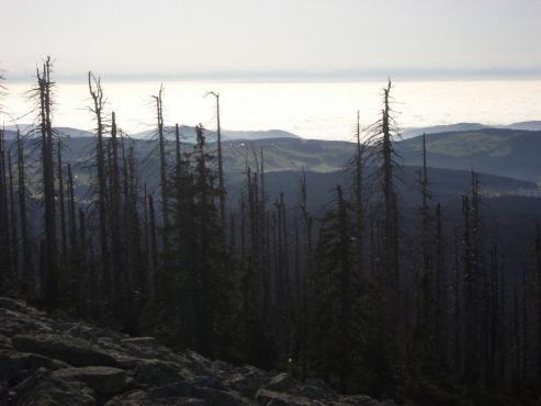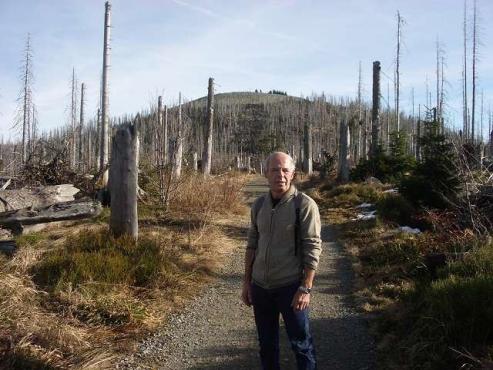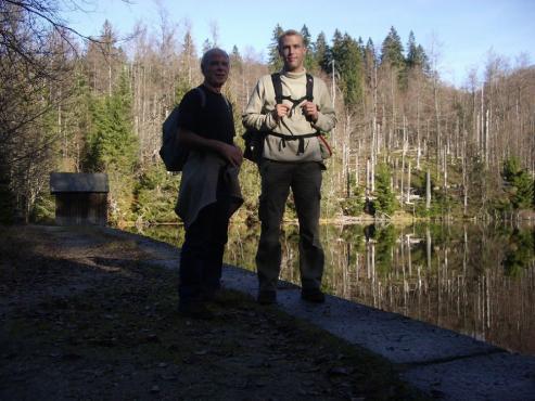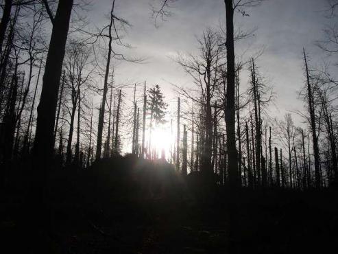 Abstieg: Danach geht es durch einen ziemlich stark beschädigten Bergfichtenwald (Windbruch / Borkenkäfer) bis zur Wegkreuzung "Schutzhütte Böhmweg". Von dort über das Teufelsloch (Felsschlucht) zur Martinsklause. Von der Martinsklause dann je bis nach Ausgangspunkt zum Parkplatz Fredenbrücke oder zum Parkplatz in Waldhäuser.