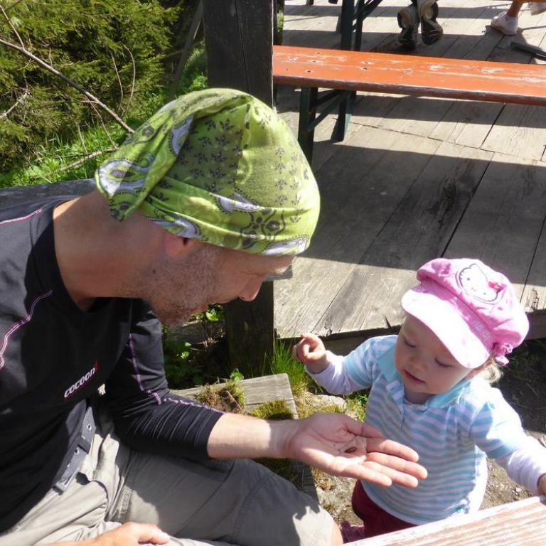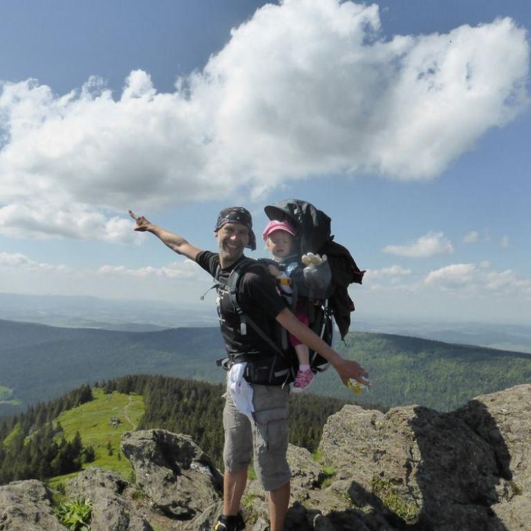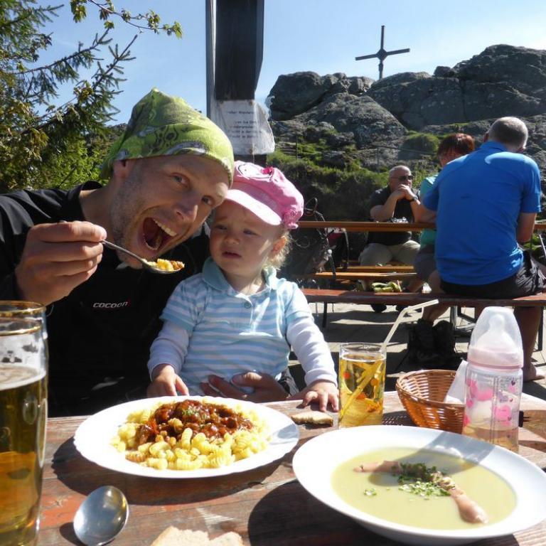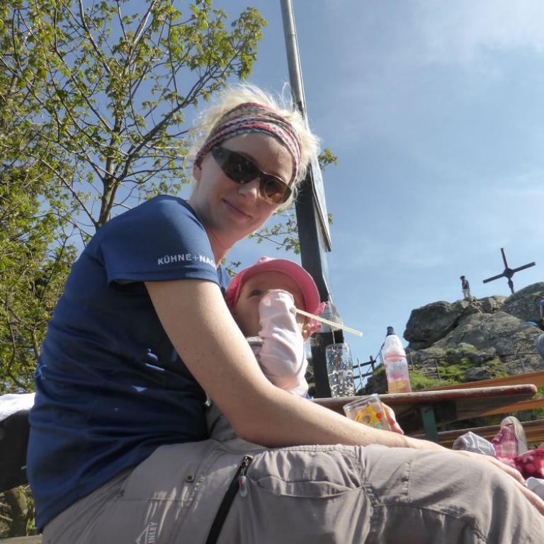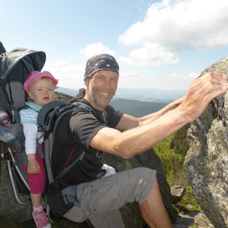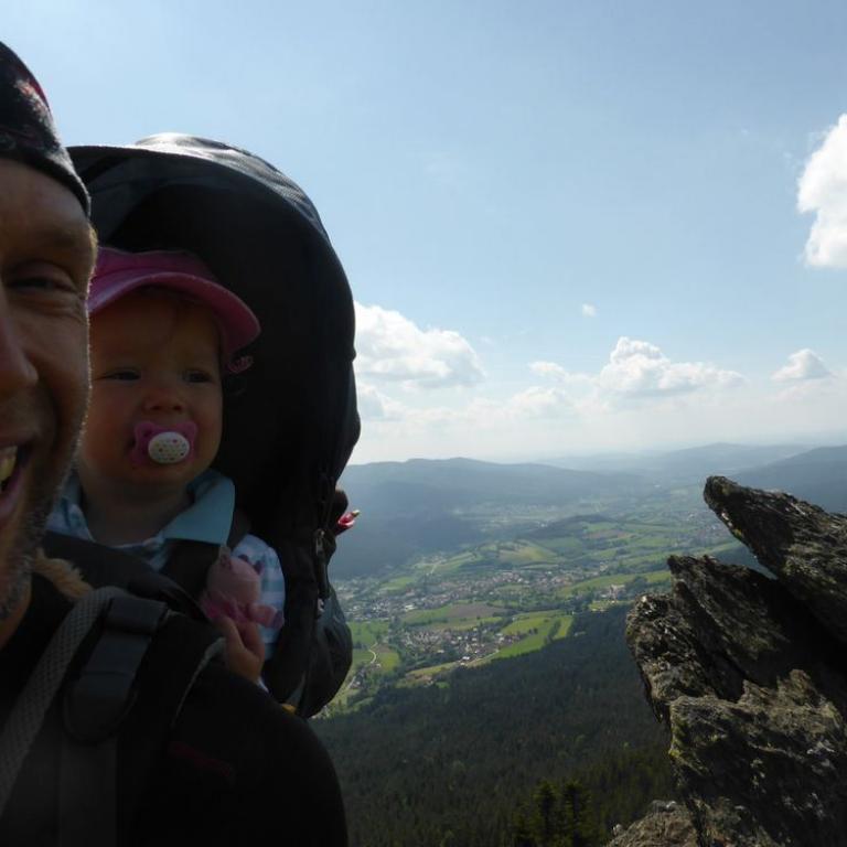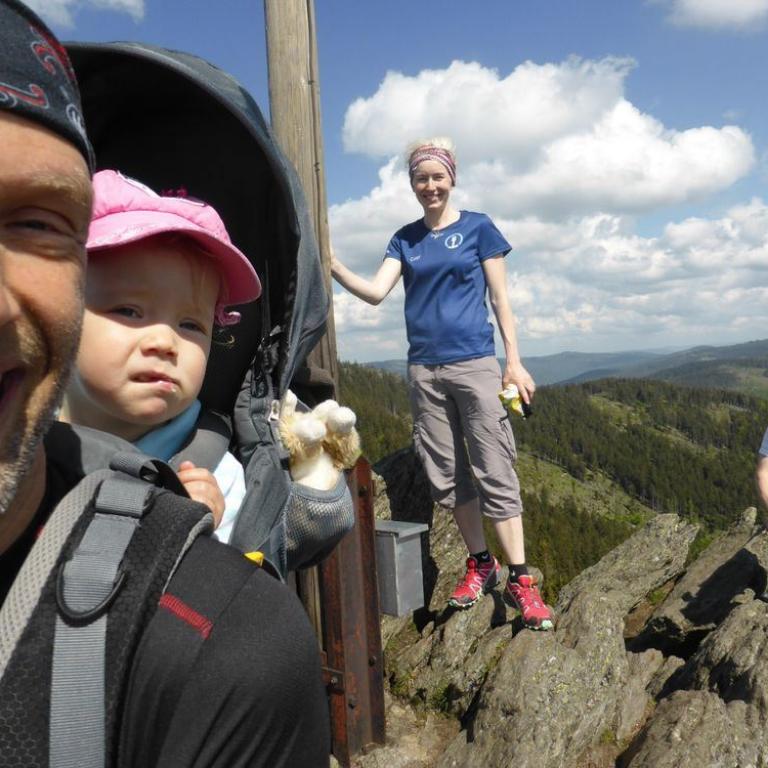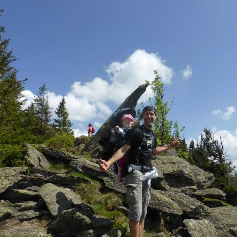 Am Vormittag war noch putzen angesagt, was unsere Wohnung dringend nötig hatte :-) Bei herrlichem Wetter fuhren wir dann erst um kurz nach 13 Uhr in Schwarzach los. Ziel war der Wanderparkplatz in Lam am Osserparksattel auf ca. 900 Höhenmetern. Der Parkplatz war überfüllt, aber die ersten fuhren schon wieder nach Hause, so das wir noch einen Platz fanden. Emma marschierte zuerst selbst den steinigen Weg nach oben. Sie fand kleine, große, dreckige und nasse Steine :-) Irgendwann war ihr die Kraxe lieber und Papa durfte die kleine Maus schleppen. Ist natürlich immer eine gute Trainingseinheit für mich. Wir bogen dann auf den Trail zur Osserwiese mit ihren markanten Felsen ab. Hier war gerade das Orgateam vom UTLW beschäftigt, die Strecke für Samstag zu markieren (Ultra Trail Lamer Winkel - 53 km 2700 Hm). Da ich im letzten Jahr auch schon hier startete, kannte ich natürlich die Strecke. Steil ging es zum kleinen Osser nach oben. Wir hatten ein Traumwetter und eine traumhafte Aussicht auf Arber und Co. Ein wenig Kletterei war auch dabei und Emma hatte ihren Spaß in der Kraxn. Vom kleinen Osser stiegen wir ein Stück ab um dann auf den Großen Osser zu wandern. Auch hier durfte ein Gipfelfoto nicht fehlen. Gleich unterhalb des Gipfels liegt das Osserschutzhaus, wo wir uns mit Gulasch, Nudeln, Suppe und Radler stärkten, bevor es den direkten Weg zum Ossersattel zurück ging.