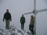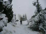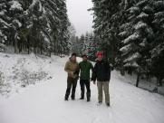 Um halb 10 Uhr trafen wir (Brigitte, Wolfi und ich) uns am Osserparkplatz in Lohberg bei Lam mit unserem Kumpel Christoph und starteten unsere Tour auf das Matterhorn des Bayerischen Waldes. Es hatte schon im Tal ziemlich viel Schnee, was ungewöhnlich für diese Zeit war. Wir stapften durch den Schnee auf einsamen Pfaden und querten immer wieder eine Forststraße, bis wir nach ca. 1 1/2 Stunden die letzten Meter zum Gipfel erreichten. Über einen vereisten und rutschigen Weg, der teilweise mit Seilen versichert war, stiegen wir auf den Gipfel des, in Nebel liegenden, großen Ossers mit seinen 1293 m. Ein eisiger Wind wehte uns entgegen, so das wir schnell die Flucht ergriffen. Da war natürlich das Osserschutzhaus knapp unterhalb des Gipfels sehr willkommen. In der warmen Stube gab es Erbsensuppe und Weißbier. Mittags stiegen wir wieder in Richtung Tal ab. Über einen anderen Weg, teilweise direkt durch den Wald, ging es durch den Schnee zurück zum Parkplatz.