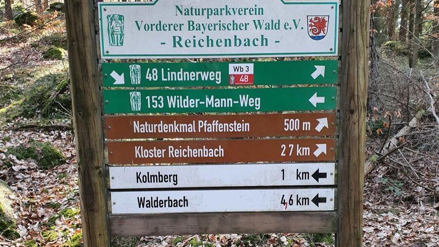 Gerne sind wir bei unseren Freunden den Fuchsn in Zell zu Gast. Zuerst aßen wir gemeinsam im Gashof Schwarzfischer zu Mittag und fuhren dann nach Kolmberg. Hier parkten wir kurz vor der kleinen Ortschaft am Waldrand, wo auch der Wegweiser unser Ziel Pfaffenstein zeigte.
