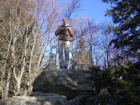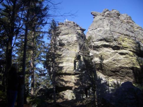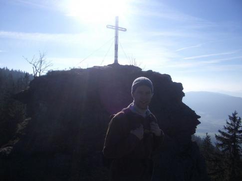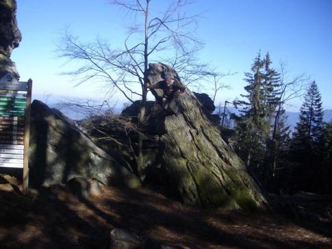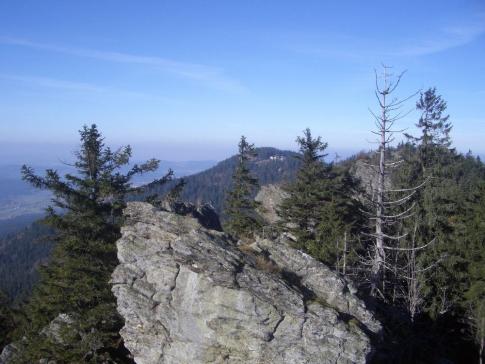 Tourbericht: Um 8 Uhr fuhren wir nach Eck in der Nähe von Kötzting. Wir hatten strahlend blauen Himmel aber es war eisig kalt. Am Wanderparkplatz des Berggasthofes Eck auf 843 m stellten wir unser Auto ab. Wir verfehlten gleich als erstes den Wegweiser und so gingen wir einfach die Skipiste nach oben. Nach einigen steilen Minuten erreichten wir auch wieder den Wanderweg, der die Piste kreuzte. Nach einem steilen ca. halbstündigen Anstieg über 300 Höhenmeter zum Riedelstein (1132 m) beginnt der gemütlichere Teil der Wanderung mit herrlichen Aussichten auf den Osser, den Hohen Bogen und ins Zellertal sowie ins Regental. In der Sonne war es sogar so richtig schön warm. Die an die Alpen erinnernden Felspartien und Steilhänge bieten einen wunderschönen Blick über Zeller Tal und Vorderen Bayerischen Wald und bei Föhnwetterlage sogar zu den Alpen.
