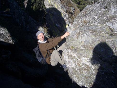 Vorbei an den Rauchröhren, zwei Felstürmen, die besonders bei Kletterern sehr beliebt sind, zieht sich der Steig weiter am Grat entlang. Nach ca. einer weiteren Stunde sehen wir schon die Kötztinger Hütte auf dem Mittagsstein (1034 m). Nach ca. einer halben Stunde erreichten wir die Kötztinger Hütte. Da die Sonne herrlich warm war, entschlossen wir uns draußen zu sitzen. Wir bestellten uns eine Radler und Erbsensuppe. Nach dem wir gestärkt waren, wanderten wir den gleichen Weg wieder zurück. Zwischendurch machten wir noch eine kurze Rast, wo es Apfel und Müsliriegel gab. An den Rauchröhren versuchte ich noch kurz mein nicht vorhandenes klettertechnisches Können zu zeigen. Um halb 2 Uhr erreichten wir wieder den Wanderparkplatz von Eck.