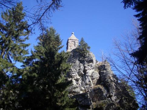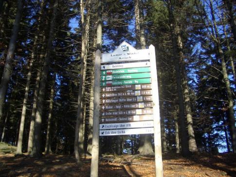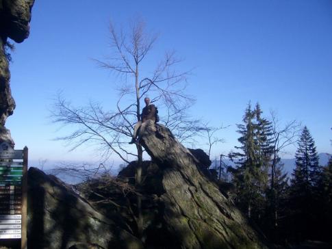 Tourbericht: Um 8 Uhr fuhren wir nach Eck in der Nähe von Kötzting. Wir hatten strahlend blauen Himmel aber es war eisig kalt. Am Wanderparkplatz des Berggasthofes Eck auf 843 m stellten wir unser Auto ab. Wir verfehlten gleich als erstes den Wegweiser und so gingen wir einfach die Skipiste nach oben. Nach einigen steilen Minuten erreichten wir auch wieder den Wanderweg, der die Piste kreuzte. Nach einem steilen ca. halbstündigen Anstieg über 300 Höhenmeter zum Riedelstein (1132 m) beginnt der gemütlichere Teil der Wanderung mit herrlichen Aussichten auf den Osser, den Hohen Bogen und ins Zellertal sowie ins Regental. In der Sonne war es sogar so richtig schön warm. Die an die Alpen erinnernden Felspartien und Steilhänge bieten einen wunderschönen Blick über Zeller Tal und Vorderen Bayerischen Wald und bei Föhnwetterlage sogar zu den Alpen.