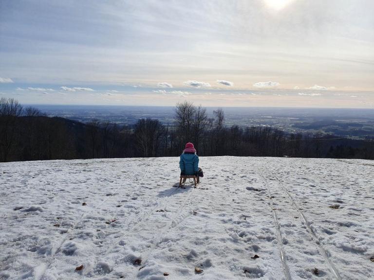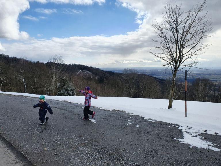 Der Frühling war schon Anfang Februar am Grandsberg eingekehrt. Zusammen mit Emmas Freundin Emily liefen und wanderten wir zum Grimmeisenweiher und über den Mühlgrabenweg auf den Schopfgipfel. Angenehme Temperaturen begleiteten uns. Die Vögel zwitscherten und der Mühlgraben plätscherte ein Frühlingslied. Das steile Stück zum Schopf nutze ich für Bergsprints. Immer wieder lief ich zu den anderen zurück, um bergauf wieder den Puls nach oben schießen zu lassen. Nach 1 1/2 Stunden erreichten wir den Schopfgipfel mit seinen stolzen 920 Metern. Zurück am Grandsbergparkplatz konnten wir 6,5 km und 230 Höhenmeter verbuchen. Klar, dass wir uns eine Stärkung im Gasthof Menauer verdient hatten...