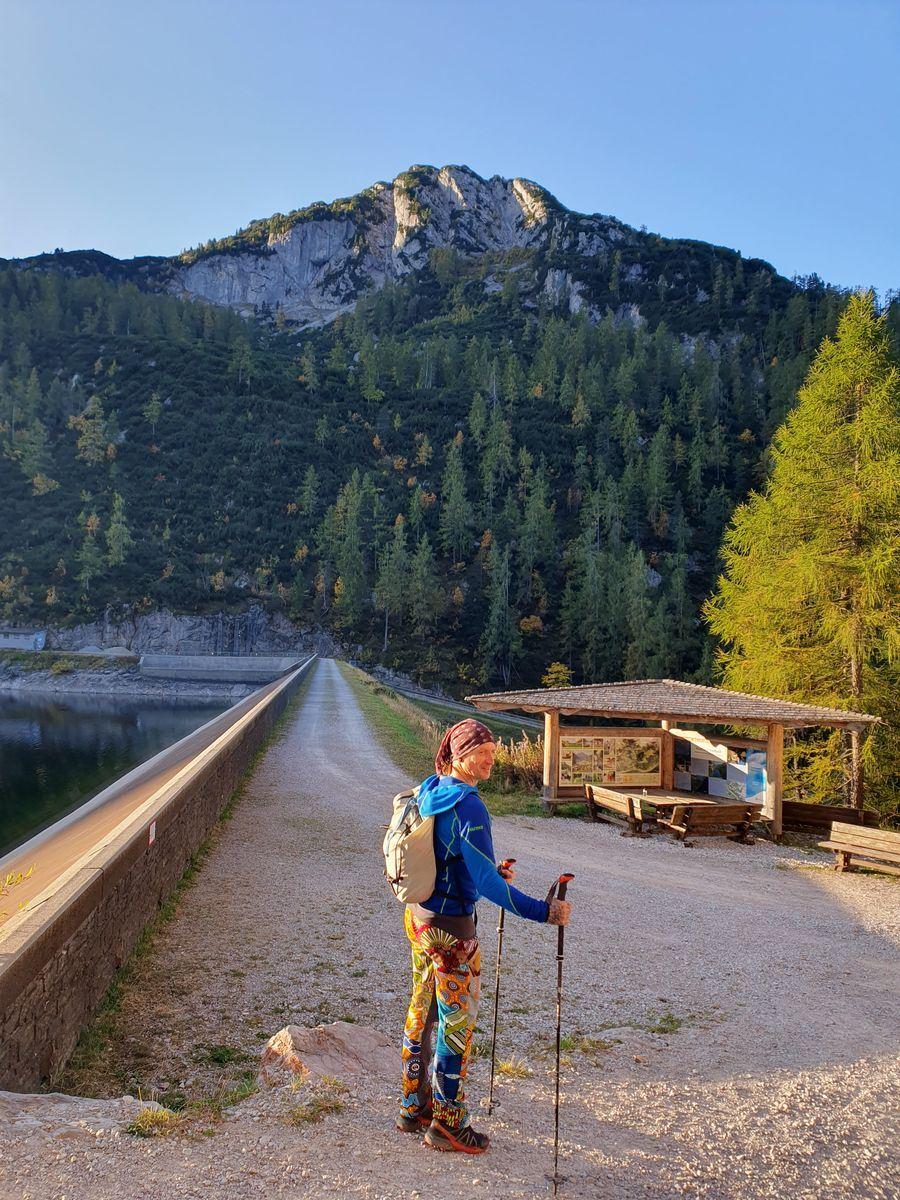 Am Parkplatz in Pürzlbach angekommen, nahmen wir unsere leichten Rucksäcke auf die Schultern und gingen los. Schnell konnten wir die vor uns gestarteten Wanderer auf dem abwechslungsreichen Forstweg einholen und gingen im Bereich der Kallbrunnalmen, einer lockeren Ansammlung von Hütten und Almen, in den Laufschritt über. An einer Wegkreuzung kurz vor der Kashüttn drehten wir nach rechts ein und folgten den Beschilderungen zum Dießbachstausee und Ingolstädter Haus. Erst verloren wir ein wenig an Höhenmeter um dann beim wunderschön gelegenen Dießbachstausee im Ständigen Auf und Ab am See entlang die verlorenen Höhenmeter wieder zu gewinnen. Wunderschön ging es auf breitem Weg in einem schon teilweise herbstlich gefärbten Mischwald Richtung Talstation der Materialseilbahn hinauf. Ab da veränderte sich die Wegbeschaffenheit von Weg auf Steig. Richtig steil ging es in Serpentinen auf groben Schotter Richtung Dießbachscharte hinauf. Von hier aus hatten wir einen gewaltigen Blick zurück auf den Stausee. Nur noch ein paar Minuten waren es auf dem Schottersteig zum ersten Zwischenziel, dem Ingolstädter Haus hinauf. Was für eine Aussicht auf das Steinerne Meer. Im Sommer sieht es doch anders aus, aber nicht minder eindrucksvoll.