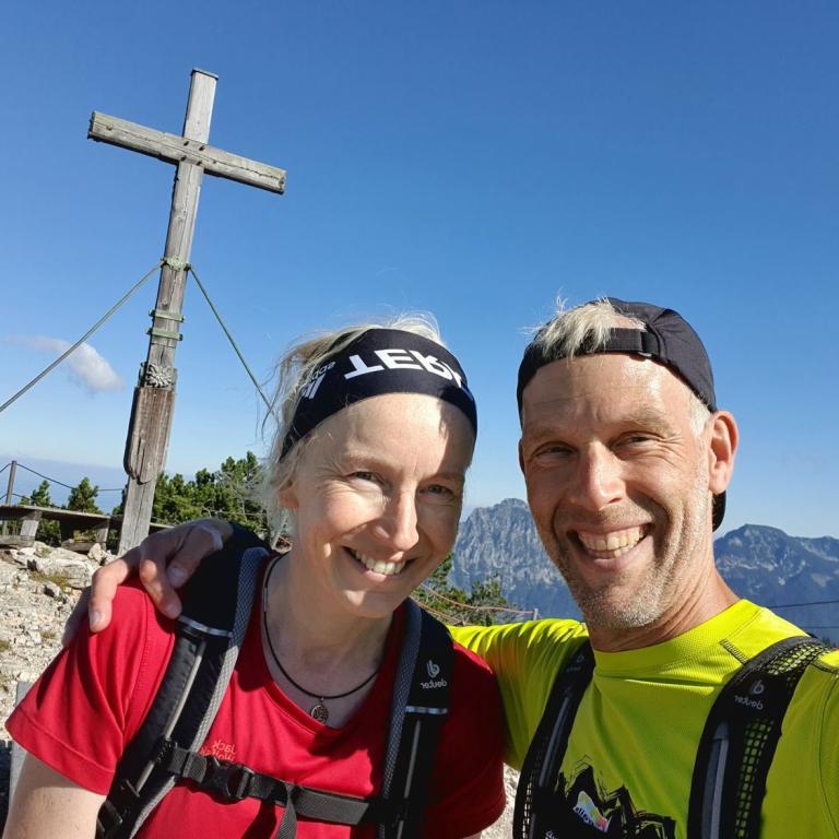 Da unsere Kinder bei der Omi und dem Opa am Wochenende im Urlaub waren, nutzten Brigitte und ich das schöne Wetter aus und machten die Berge unsicher. An der Schlafenden Hexe (Lattengebirge) sind wir schon tausend Mal vorbeigefahren, aber jetzt wollten wir sie überschreiten. Das Lattengebirge ist ein Teil der Berchtesgadener Alpen. Unser Plan stand fest: Überschreitung von West (B21) nach Ost (B20). Wir deponierten die Mountainbikes am Wanderparkplatz am Hallthurm und fuhren mit dem Auto zur Stauwehr bei Bad Reichenhall.