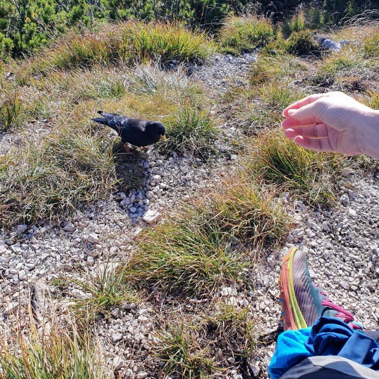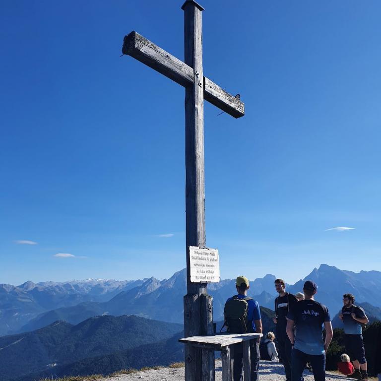 Man folgt dem Kammverlauf bis zur Abzweigung Karkopf 1739 m, dem höchsten Punkt der Überschreitung. Der Abzweiger auf den Gipfel lohnt sich und man hat wieder eine wunderbare Aussicht. Hier bietet sich eine kurze Rast an um das Bergpanorama zu genießen. Sicherlich bekommt man Besuch von der einen oder anderen Bergdohle, die auf eine kleine Brotzeit hofft...