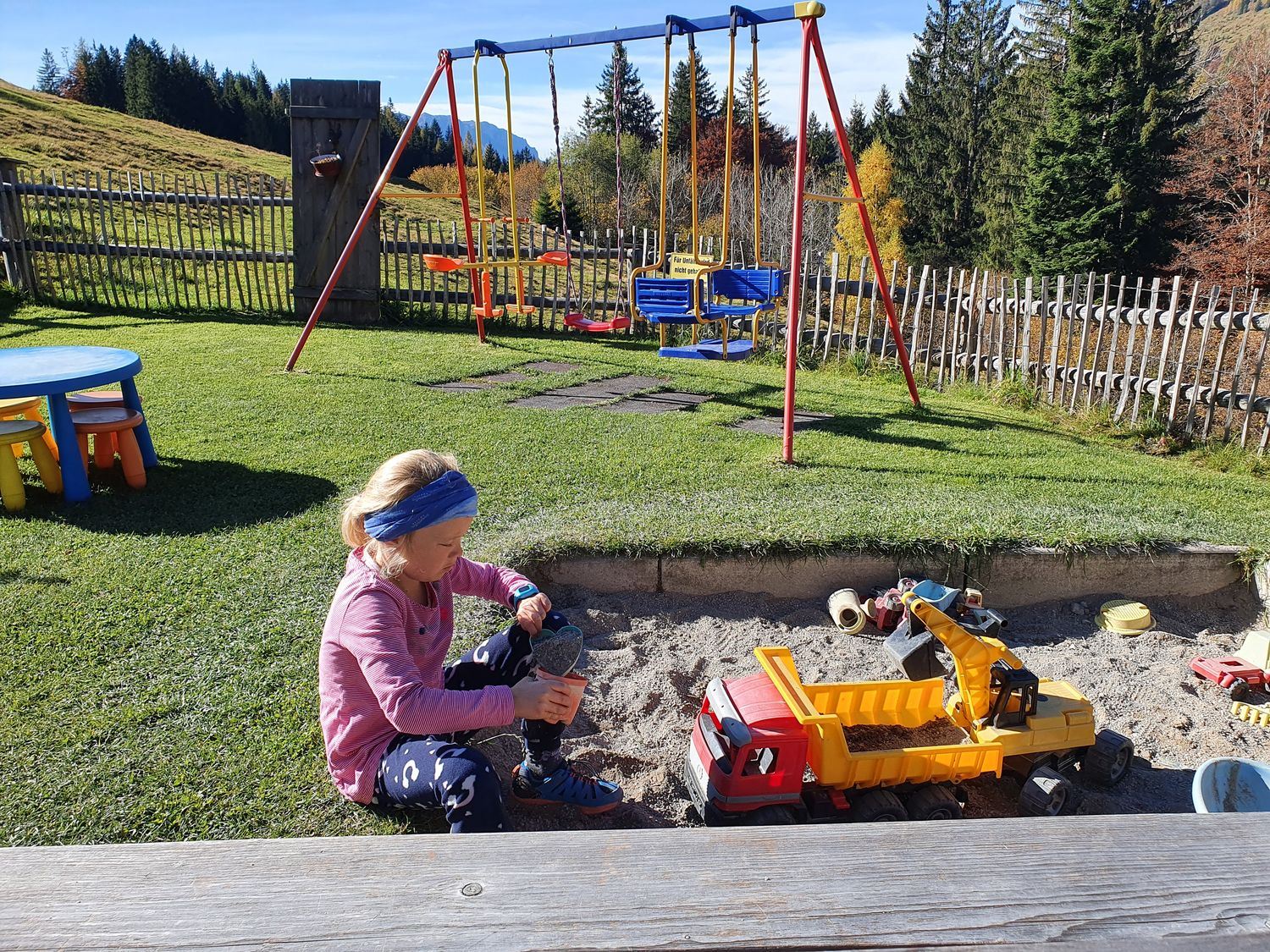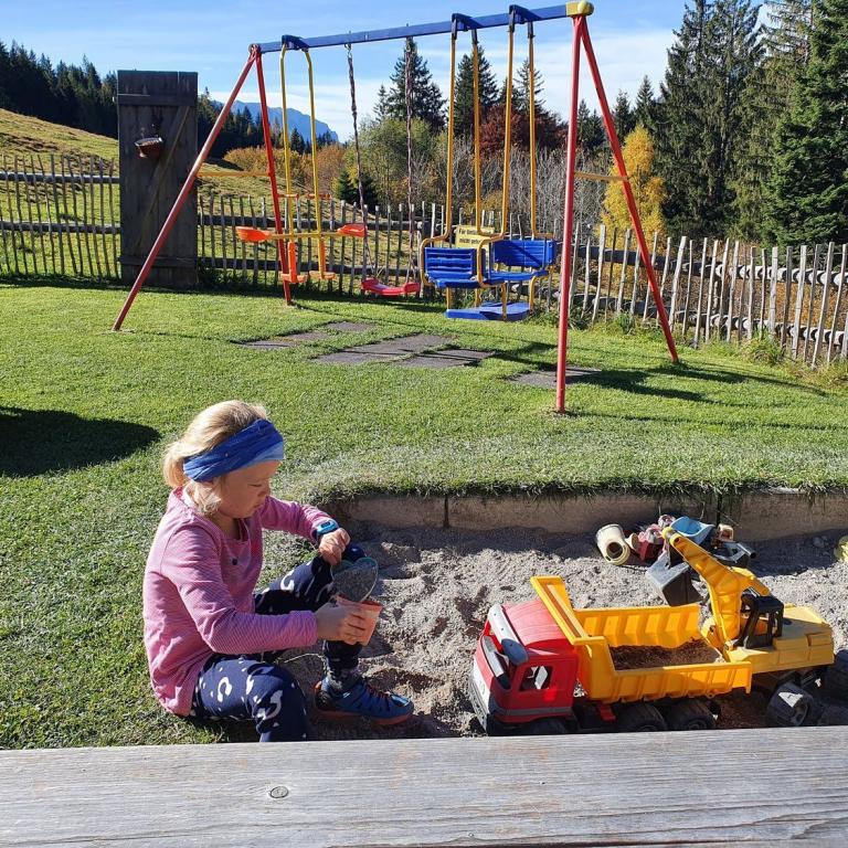 Von der Sauermöseralm sind es nur ca. 10 Minuten bis zur bewirtschafteten Stoibenmöseralm, die ebenfalls mit einem kleinen Spielplatz ausgestattet ist. Hier können wir nur empfehlen zum kleinen Aussichtspunkt "Chiemseeblick" östlich der Hütte hochzuwandern. Von dort an man eine geniale Aussicht auf den Chiemsee, Hochgern und das Tal mit den Ortschaften Unter- und Oberwössen.
