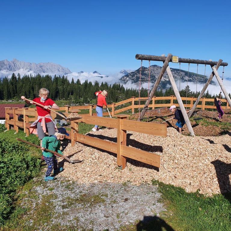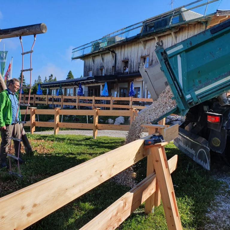 Arbeitseinsatz - Am Morgen wurden wir von der Sonne begrüßt und mit einer Traumaussicht auf die umliegenden Berge konnte der Tag beginnen. Schnell waren wir angezogen und saßen beim Frühstück. Danach war ein kleiner Arbeitseinsatz geplant. Ein Lastwagen brachte Hackschnitzel für den Spielplatz. Die Mädels und die Kinder verteilten diese fleißig. Der Rest entrümpelte den Keller (für einen Kinderspielraum), um alles auf dem LKW zu verstauen. Da wir viele fleißige Hände hatten, waren wir schnell fertig und als Belohnung bekam jeder ein Mittagessen und dazu ein Getränk.
