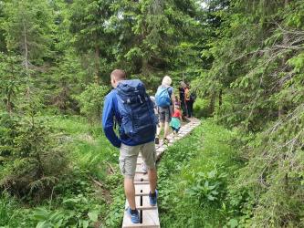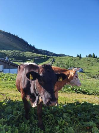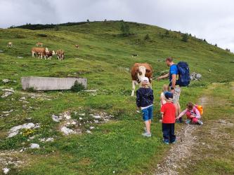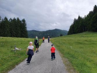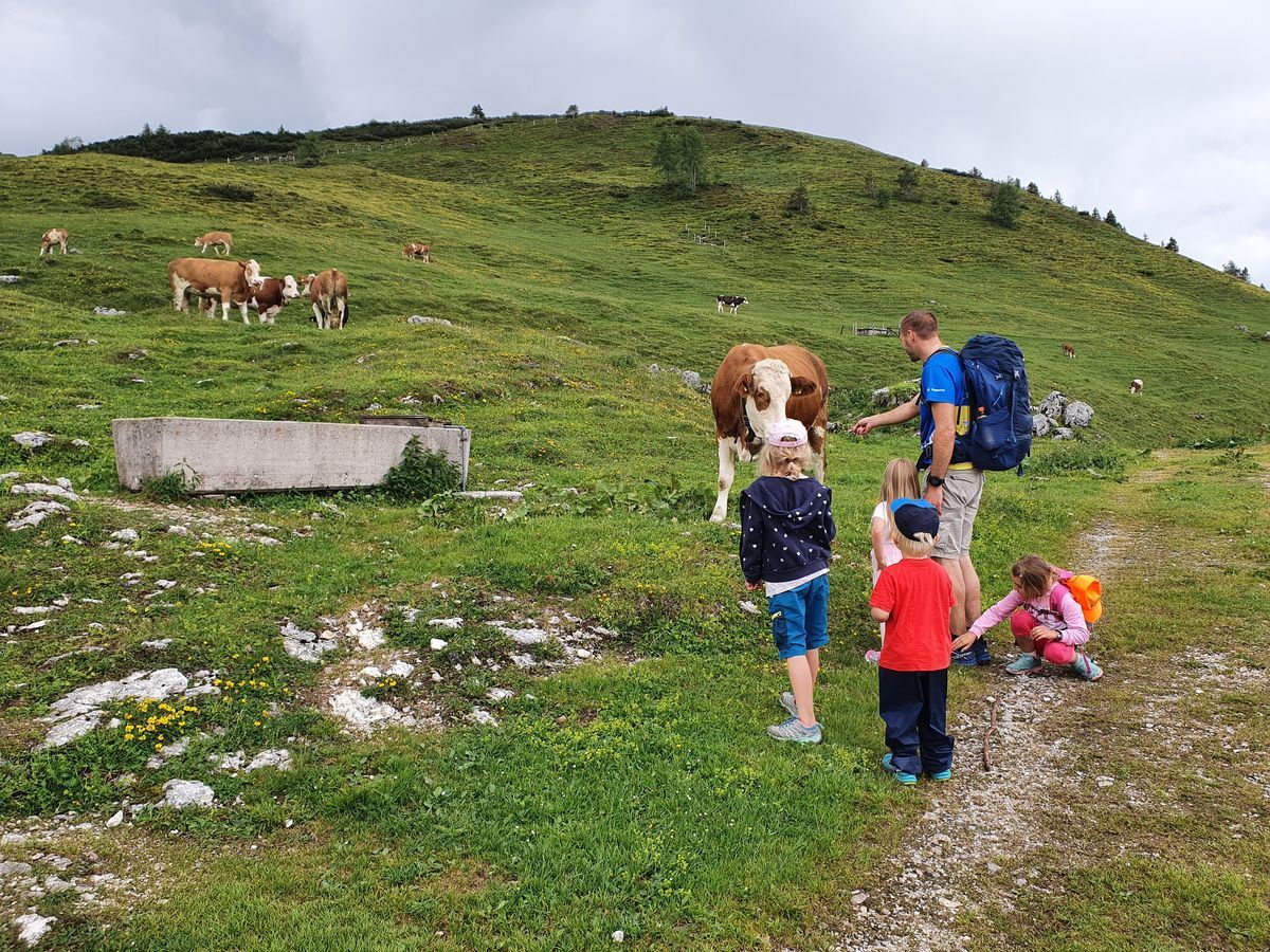 An der Almhütte zweigten wir nach rechts ab und folgten dem Wegweiser „Straubinger Haus“. Der Forstweg mündet in einen kleinen wurzeligen Steig. Für die Kinder wurde es abenteuerlicher und wir untersuchten Steine und morsche Bäume nach Kleingetier. Über einen Holzsteg ging es durch eine sumpfige Almlandschaft, bis der Aufstieg steiler wurde. Das Wetter hielt noch perfekt. Das ein oder andere Mal blitzte die Sonne heraus. Sollten wir tatsächlich vom Regen verschont bleiben? Es sah fast so aus. Auf einer letzten Brotzeitbank gab es noch eine kleine Stärkung, bevor der Schlussanstieg zur Kapelle oberhalb des Straubinger Hauses gemeistert wurde. Uns begrüßten ganz vorsichtig und mit Corona-Abstand ein paar misstrauische Kühe. Zum Glück hatte der Wetterbericht unrecht und wir kamen trocken nach ca. 1 ½ Stunden Aufstieg am Straubinger Haus auf 1558 m an.