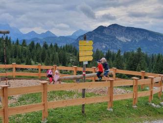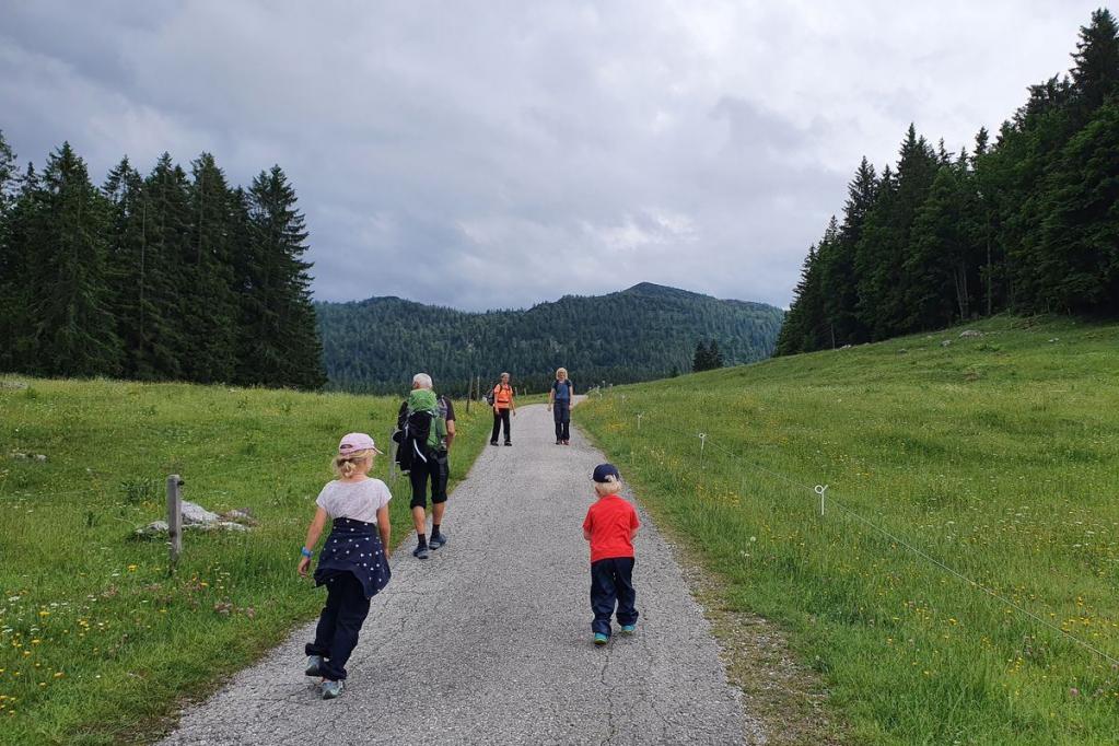 Aufstieg - Jedes Jahr ist eines der Hüttenhighlights meiner Kinder die Übernachtung im Straubinger Haus auf der Eggenalm. Mein Kleinster, Timi, ist nun schon zum 2. Mal dabei, obwohl er erst 3 Jahre alt ist. Eigentlich war eine Wanderung ab der Steinplatte geplant, aber wetterbedingt mussten wir umdisponieren und uns für die kürzere Variante ab Hindenburghütte entscheiden. Am Wanderparkplatz in Blindau bei Reit im Winkl trafen wir uns mit Freunden. Zufällig traf zeitgleich die Mountainbike Gruppe ein, um nach oben zu strampeln. Wir fuhren mit dem Shuttle zur Hindenburghütte auf 1260 m. Hier wanderten wir mit den Kindern zuerst auf der Forststraße bis zur Hemmersuppenalm. Natürlich brauchten unsere Zwerge schon nach ein paar Metern die erste kleine Brotzeit. Wer wandert, der hat auch eine Stärkung verdient :-)