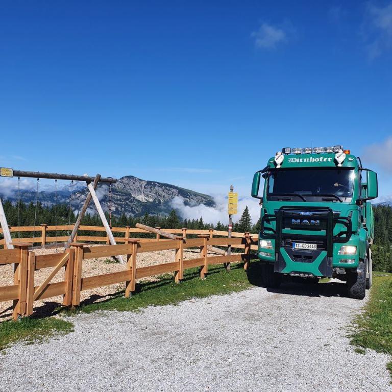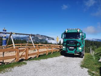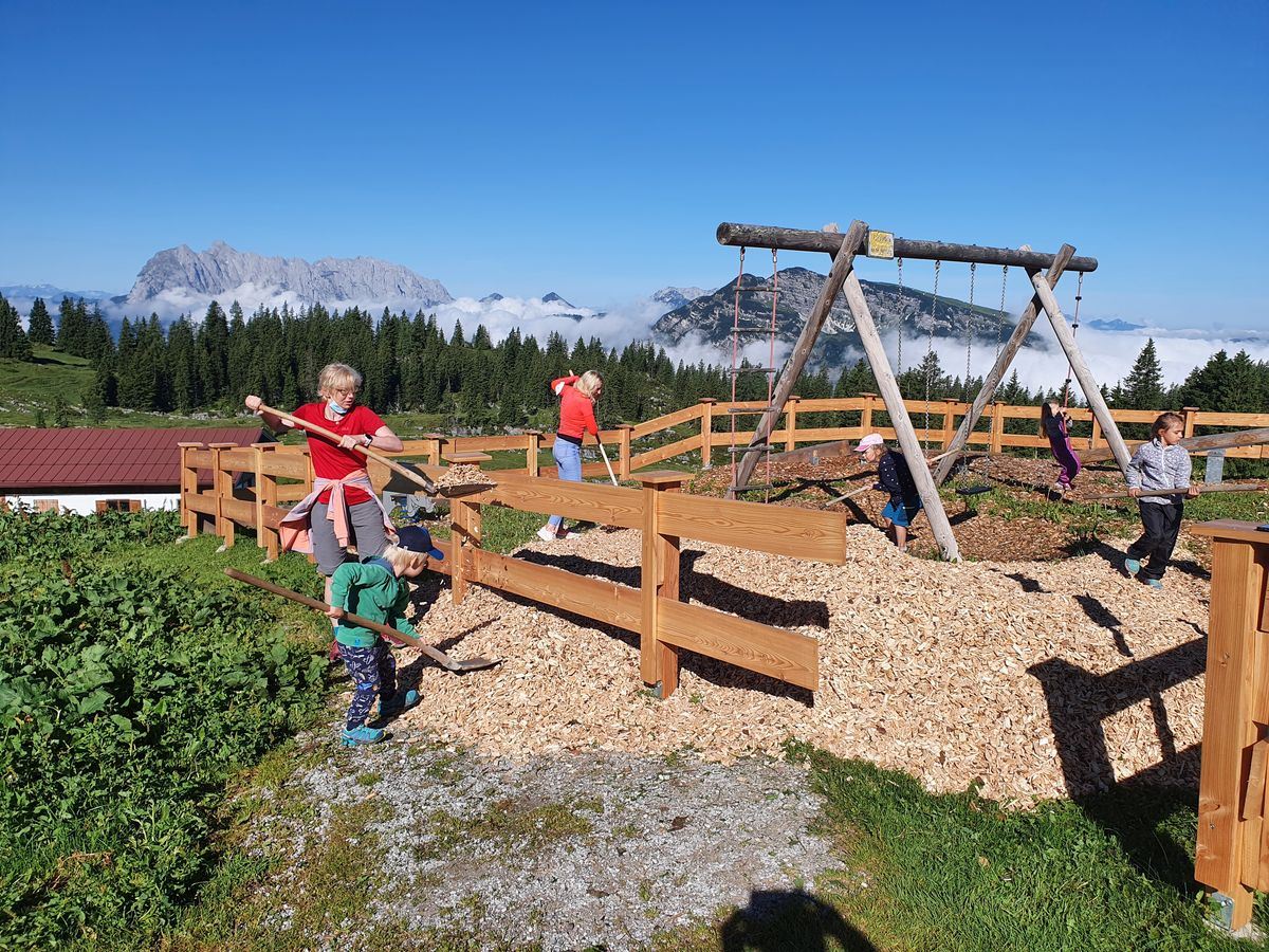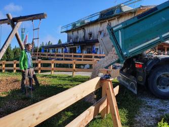Arbeitseinsatz - Am Morgen wurden wir von der Sonne begrüßt und mit einer Traumaussicht auf die umliegenden Berge konnte der Tag beginnen. Schnell waren wir angezogen und saßen beim Frühstück. Danach war ein kleiner Arbeitseinsatz geplant. Ein Lastwagen brachte Hackschnitzel für den Spielplatz. Die Mädels und die Kinder verteilten diese fleißig. Der Rest entrümpelte den Keller (für einen Kinderspielraum), um alles auf dem LKW zu verstauen. Da wir viele fleißige Hände hatten, waren wir schnell fertig und als Belohnung bekam jeder ein Mittagessen und dazu ein Getränk.