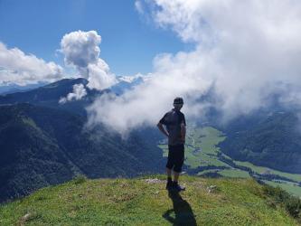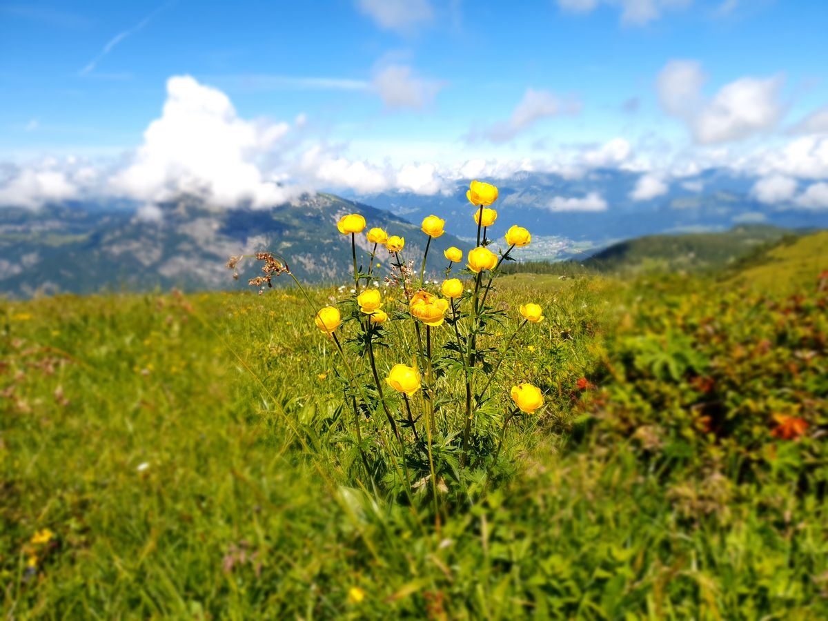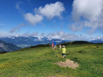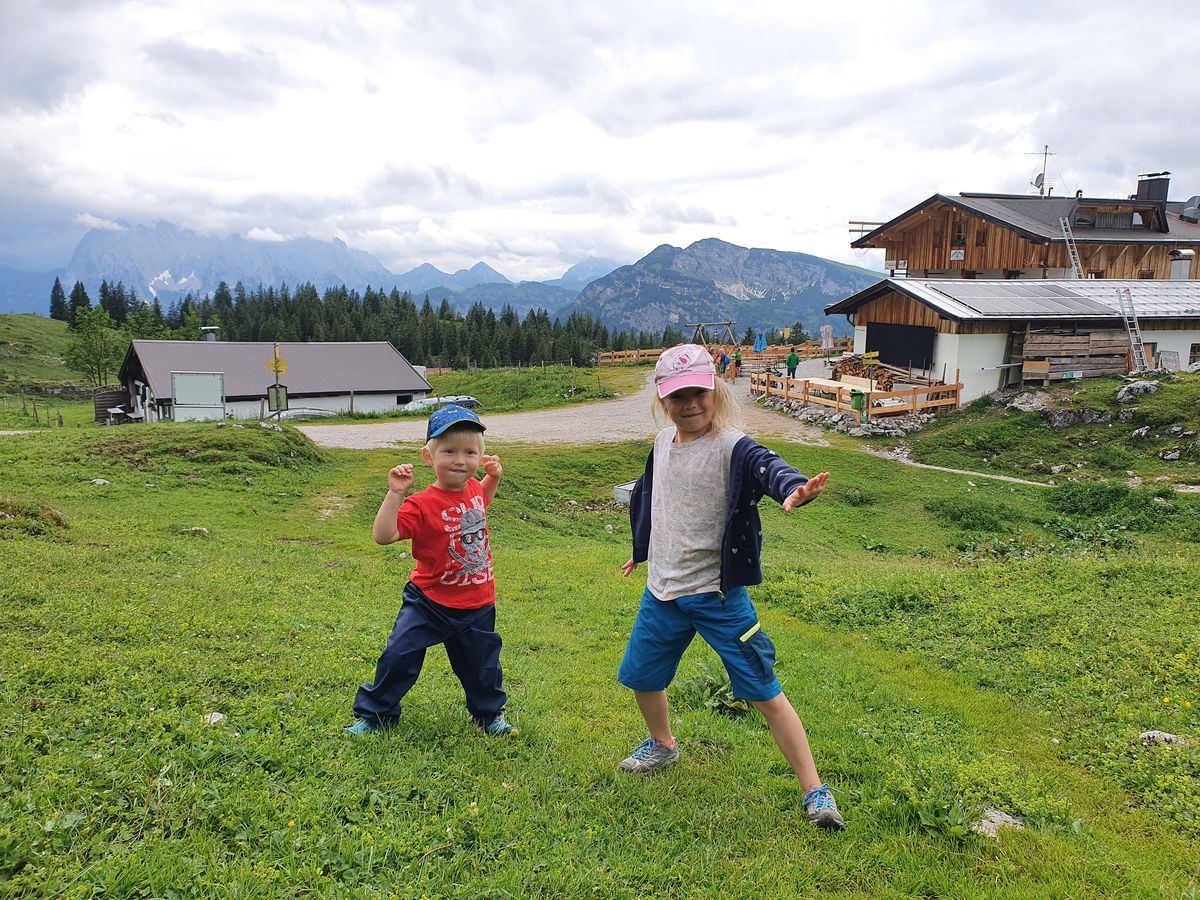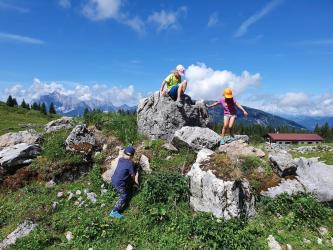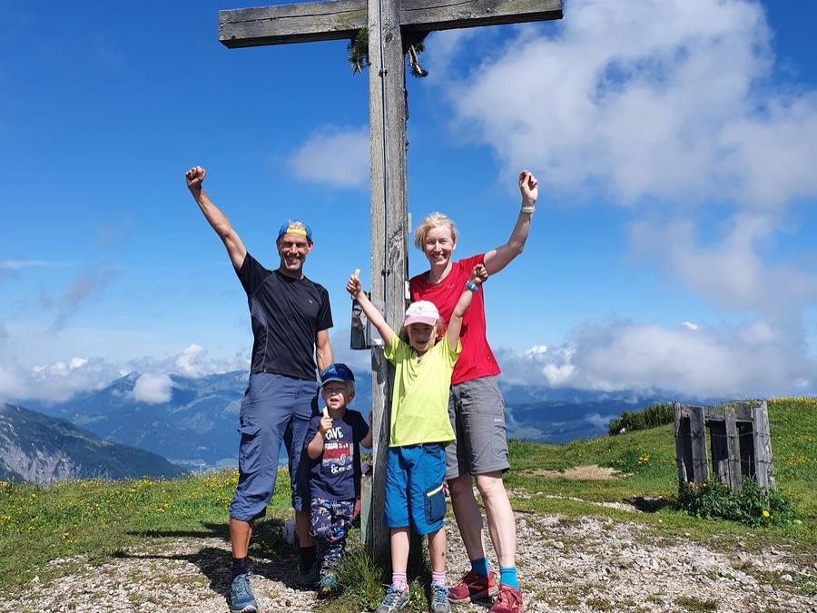 Rundtouren - Zuvor war natürlich noch eine Besteigung des Fellhorns auf dem Plan. Mit leichtem Gepäck* marschierten wir den kleinen Steig nach oben. Die Mountainbike-Gruppe mit Xaver als Guide radelte zu einer Rundtour über den Kanonenpass zur Röthelmoosalm und Weitsee ebenfalls los. Die Kinder stiegen hochmotiviert nach oben. Nach nur einer halben Stunde konnten wir den Gipfelsieg für uns verbuchen. Vom Fellhorn 1764 m hatten wir eine traumhafte Aussicht auf den Kaiser & Co. In weiter Ferne konnte man sogar den schneebedeckten Großvenediger erkennen. Natürlich wurden die Mäuse mit einer süßen Gipfelstärkung belohnt.