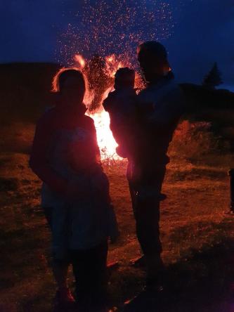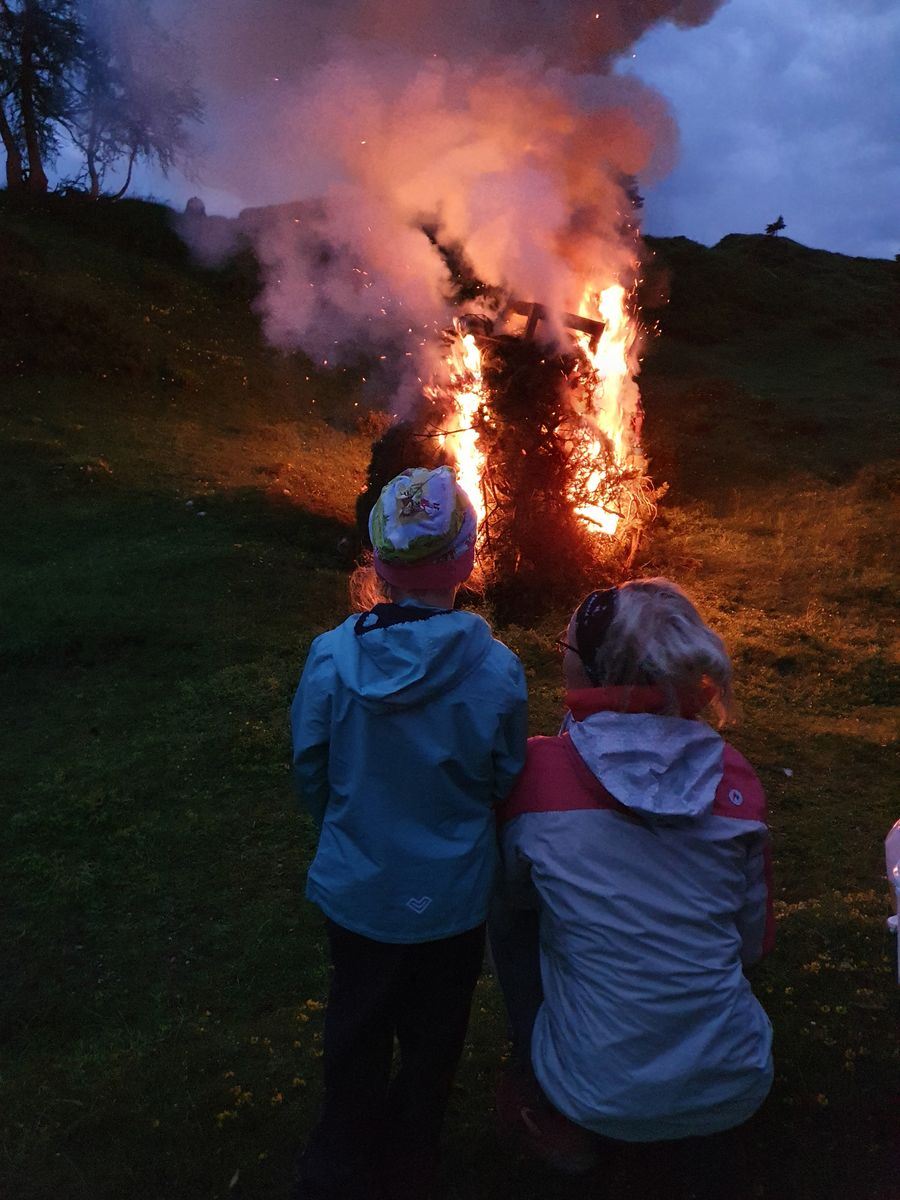 Sonnwendfeuer - Wir marschierten mit Stirnlampen* bewaffnet zum nahegelegenen Hügel, wo das Sonnwendfeuer angezündet wurde. Die Kinder staunten, wie schnell so ein Feuer in die Höhe schießt. Langsam wurde es Zeit für die Kleinen ins Bett zu gehen. Auf dem Rückweg fing es dann doch noch zu regnen an und wir wurden bis auf die Unterhose pitschnass. Den Kindern hatten Spaß daran, vor allem, weil sie im Schubkarren von Sepp über Stock und Stein zur Hütte geradelt wurden. Müde fielen die Kinder ins Bett und die Erwachsenen erzählten sich noch bei dem ein oder anderen Glas Wein Bergsteigergeschichten.