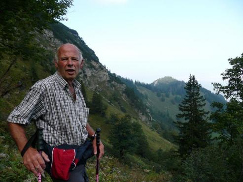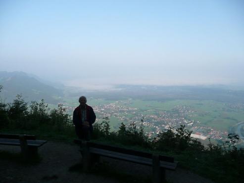 Da wir in Grassau übernachteten, konnten wir schon um halb 8 am Wanderparkplatz in Marquartstein losgehen. Zuerst ging es in Richtung Schnappenkirche. Auf der Strecke nahm ich noch einen Geocach mit, der an einem steilen Fels versteckt war. Nach ca. 1 1/2 Stunden erreichten wir die auf 1100 Metern gelegene Schnappenkirche. Von hier wanderten wir zur Staudacher Alm. Der Weg dorthin führte uns zuerst steil nach oben und dann wieder ca. 100 Höhenmeter nach unten bevor wir die Alm erreichten. Von hier ging es den anstrengenden und steilen Jägersteig Richtung Hochgerngipfel. Nach dem Überschreiten einer Scharte ging es weniger steil bis zum Gipfel. Wir benötigten insgesamt ca. 3 1/2 Stunden bis wir auf dem Gipfel standen. Leider waren die meisten umliegenden Berge von Wolken bedeckt und nur zaghaft kam die Sonne heraus. Nach einer halbstündigen Rast wanderten wir gen Tal. Rast machten wir nochmals im Hochgernhaus ca. 45 Minuten unterhalb des Gipfels auf 1400 Metern. Mit Weißbier und Kaiserschmarrn gestärkt ging es dann den Weg zurück zum Wanderparkplatz in Marquartstein.