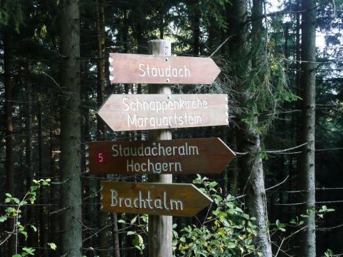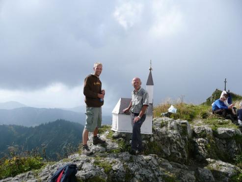 Da wir in Grassau übernachteten, konnten wir schon um halb 8 am Wanderparkplatz in Marquartstein losgehen. Zuerst ging es in Richtung Schnappenkirche. Auf der Strecke nahm ich noch einen Geocach mit, der an einem steilen Fels versteckt war. Nach ca. 1 1/2 Stunden erreichten wir die auf 1100 Metern gelegene Schnappenkirche. Von hier wanderten wir zur Staudacher Alm. Der Weg dorthin führte uns zuerst steil nach oben und dann wieder ca. 100 Höhenmeter nach unten bevor wir die Alm erreichten. Von hier ging es den anstrengenden und steilen Jägersteig Richtung Hochgerngipfel. Nach dem Überschreiten einer Scharte ging es weniger steil bis zum Gipfel. Wir benötigten insgesamt ca. 3 1/2 Stunden bis wir auf dem Gipfel standen. Leider waren die meisten umliegenden Berge von Wolken bedeckt und nur zaghaft kam die Sonne heraus. Nach einer halbstündigen Rast wanderten wir gen Tal. Rast machten wir nochmals im Hochgernhaus ca. 45 Minuten unterhalb des Gipfels auf 1400 Metern. Mit Weißbier und Kaiserschmarrn gestärkt ging es dann den Weg zurück zum Wanderparkplatz in Marquartstein.