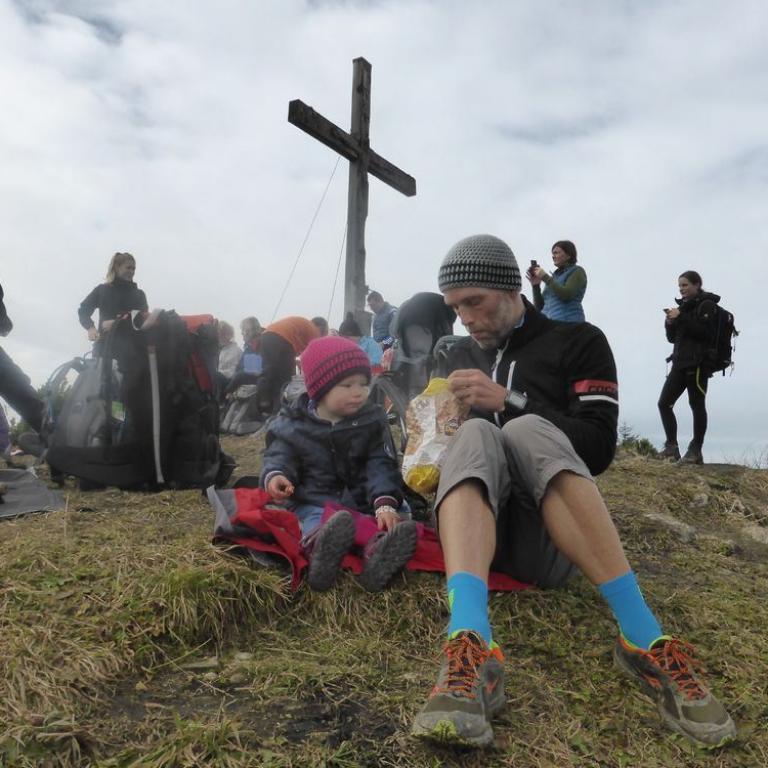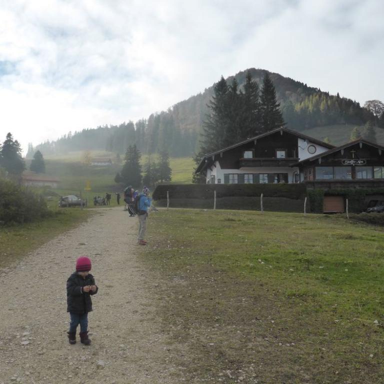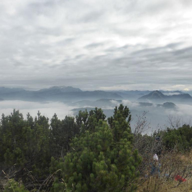 Wenn i scho mal da bin in der Gegend, wollte ich auch beim Hochplattenberglauf mitmachen :-) Vor 5 Jahren startete ich schon einmal hier. 140 Bergläufer, vor allem viele Spezialisten aus der Chiemgauer Ecke standen mit mir am Start. Auf dem ersten, ziemlich flachen Kilometer übernahm ich die Führung, aber dann wurde ich von den Berglaufspezialisten überholt. Am Berg wurden mir die Grenzen aufgezeigt :-) Trotzdem konnte ich mit meinen 28:05 Minuten auf 4,5 Kilometer und 550 Hm mit Platz 20 eigentlich zufrieden sein. Ich war schließlich um über 1 1/2 Minuten schneller als vor 5 Jahren. Gleich im Anschluß wanderten wir ab dem Ziel Staffenalm auf die Hochplatte, Emma`s 89 Gipfel mit seinen 1587 m. Leider war es ziemlich bewölkt, aber trotzdem machte die Tour wieder viel Spaß. Auf der Scharte zur Hochplatte hatten wir eine herrliche Sicht auf die Kampenwand, Geigelstein und Breitenstein. Die letzten 200 Höhenmeter führten uns durch Latschen am Grat der Hochplatte. Teilweise mussten wir wieder eine kleine Klettereinlage einlegen :-) Auf dem Gipfel der Hochplatte war ganz schön was los :-) Wir machten dann das wichtigste für Emma: nämlich Brotzeit :-) Wir genossen die doch recht gute Aussicht und steigen dann über den Forstweg wieder zur Staffn Alm ab, die noch immer im Nebel lag. Hier aßen wir Kuchen und tranken Radler. Mit der Seilbahn ging es dann wieder nach unten ins Tal...