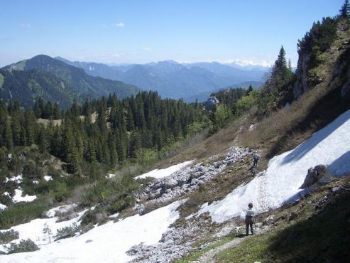 Abstieg: Auf dem Gipfel führt ein Weg weiter südlich um die Kampenwand, von wo man wieder zur Steinlingalm gelangt. Von hier geht es wieder den gleichen Weg talwärts.