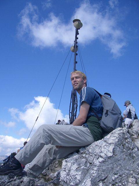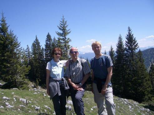 2. Tag: Für "günstige" 13 Euro pro Person rauf und runter stiegen wir dann am nächsten Tag in die etwas altertümliche Gondel der Kampenwandbahn. Nach ca. 10 Minuten Fahrt kamen wir an der Bergstation an. Das Wetter war an diesem Tag herrlich sonnig. Wir marschierten zur Steinling-Alm, wo meine Mama sitzen blieb und mein Papa und ich abzweigten zum Aufstieg auf die Kampenwand. Es ging ziemlich steil los über ein Geröllfeld auf dem auch noch vereinzelt Schnee liegt. Dann ging es weiter zwischen Steinschluchten und Kletterfelsen in Richtung Gipfel. Wir hatten ein herrliches Panorama. Über ein paar Stahlseile gelangten wir dann auf den gut befestigten Gipfel der Kampenwand (1669 m). Hier machen wir Rast und bewunderten lange die umliegenden Berge. Viele davon waren noch schneebedeckt und auch teilweise in Wolken. Nun ging es wieder abwärts über den linken Kamm der Kampenwand. Der erste Teil ist wieder mit Stahlseile gesichert und weiter gehts durch ein Latschenfeld. Wir umrunden die Kampenwand und gelangen an der Steinlingkappelle vorbei wieder zu der Steinling-Alm, wo meine Mama auf uns wartet. Mit der Kampenwandbahn fuhren wir dann am Spätnachmittag wieder ins Tal.