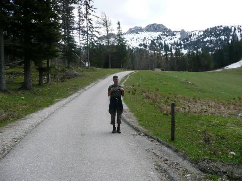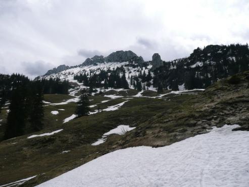 Vom Parkplatz führte uns der Weg nach links und dann geradeaus Richtung Kampenwand. An einer Weggabelung folgten wir dem Wegweiser "Steinlingalm". Teilweise ging es auf Wanderwegen und Forststraßen nach oben. Nach ca. 1 Stunde hatten wir schon einen schönen Ausblick auf die Wand. Es lag noch einiges an Schnee.