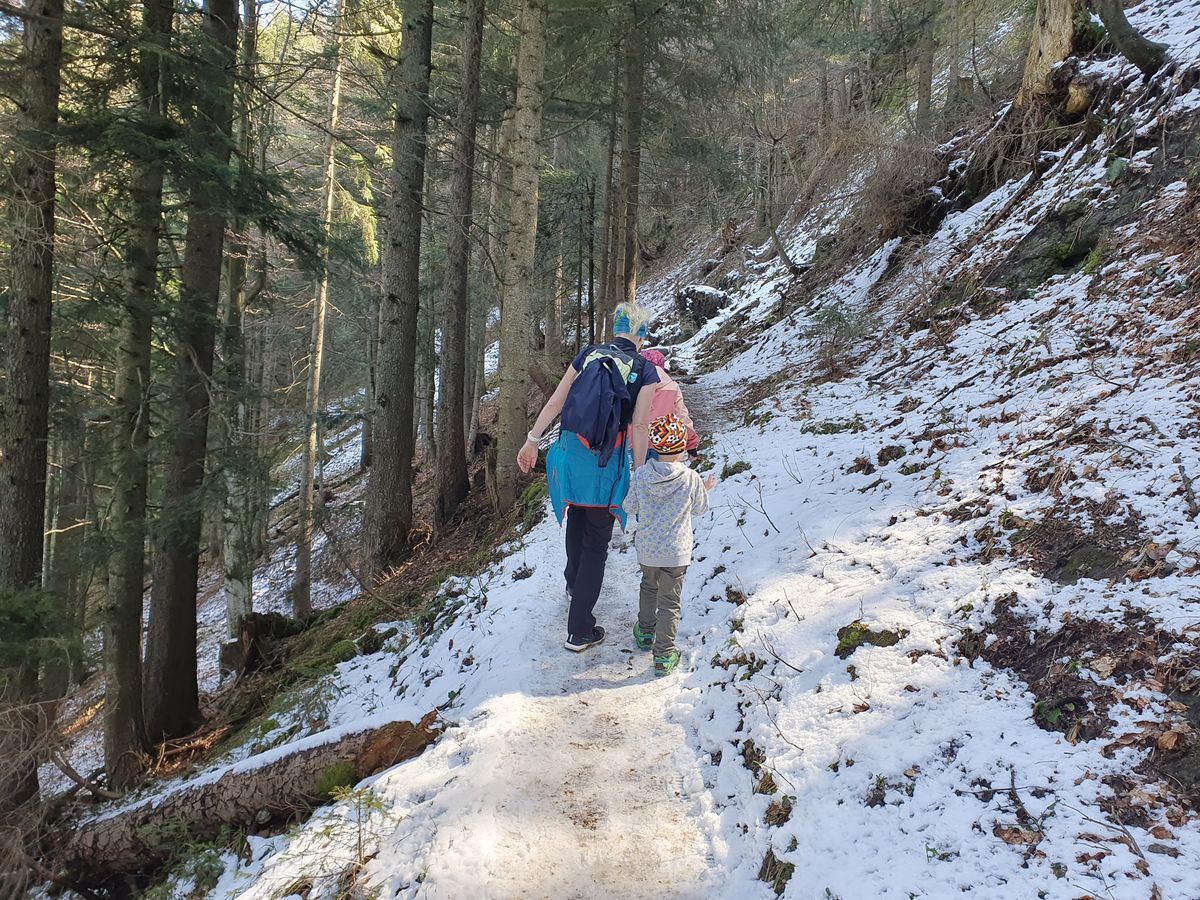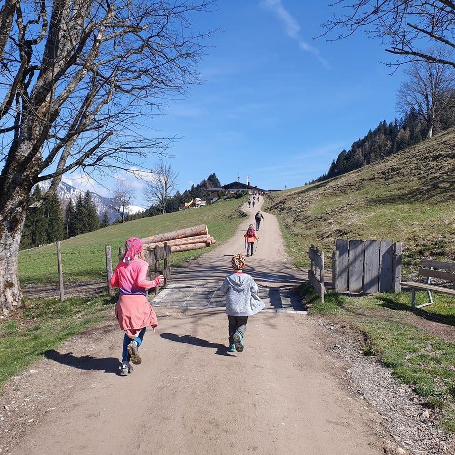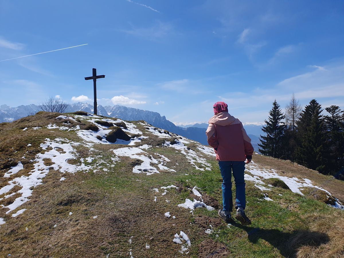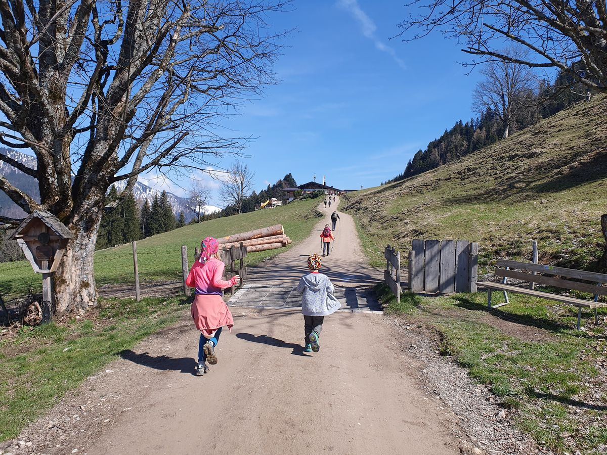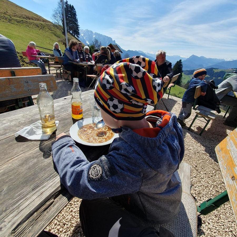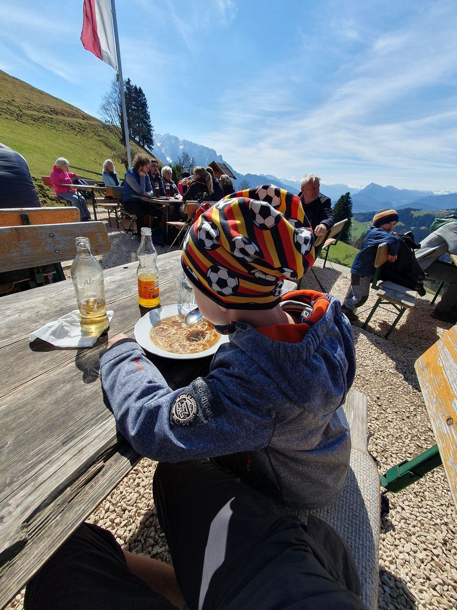 Wir wanderten vom gut gefüllten Wanderparkplatz Wildbichler Alm eine Forststraße nach oben. Viele weitere Wanderer waren unterwegs. Wir fanden einen Geocache, einen Baum zum Kraxeln und den ein oder anderen Trail als Abkürzung. Wir hatten viel Spaß beim Aufstieg und vor der Einkehr in der Wildbichler Alm sollte auch ein Gipfelsieg her. Wir entschieden uns für einen kleinen Trail, der kurz nach der Hütte rechts abzweigt. Teilweise war es dort ziemlich abschüssig und vereist. Timi bekam es etwas mit der Angst zu tun, so dass Brigitte mit ihm zur Hütte abstieg.