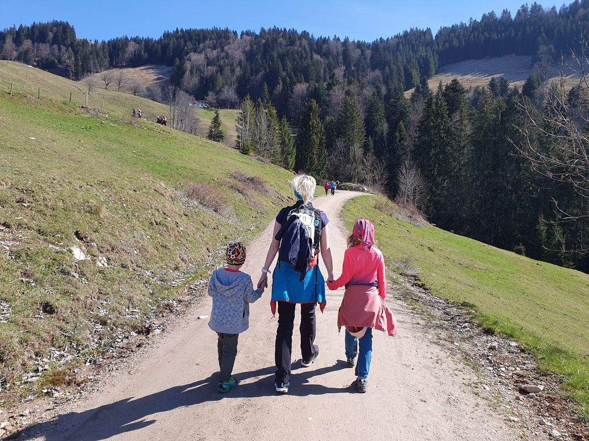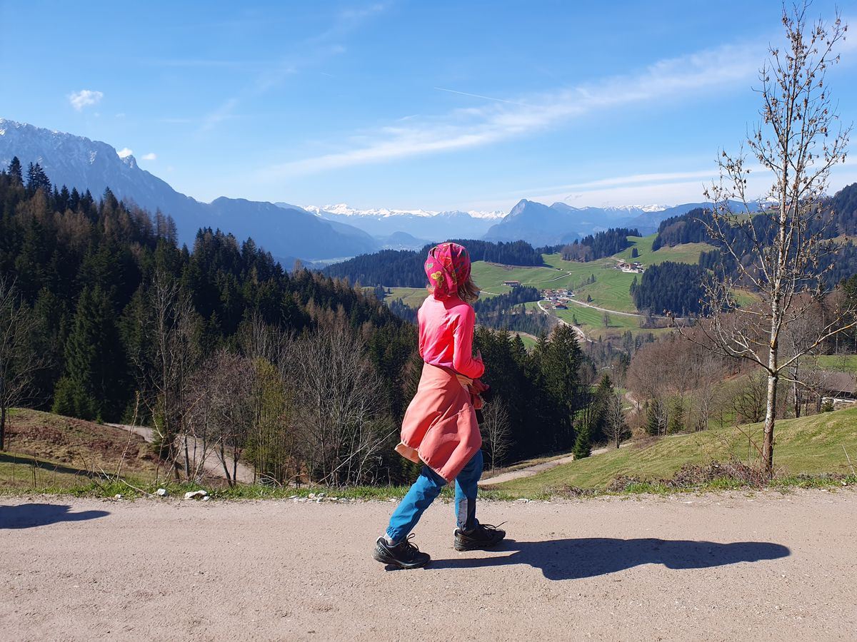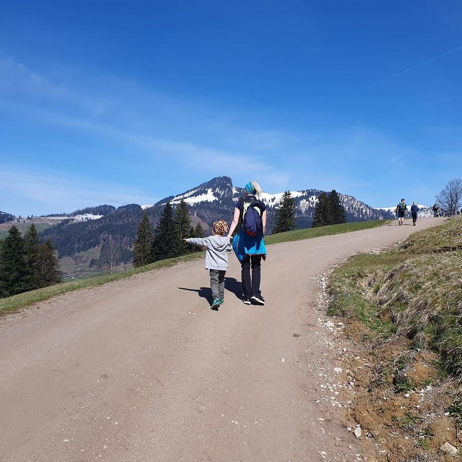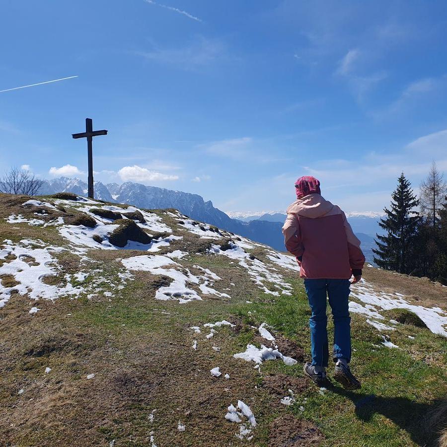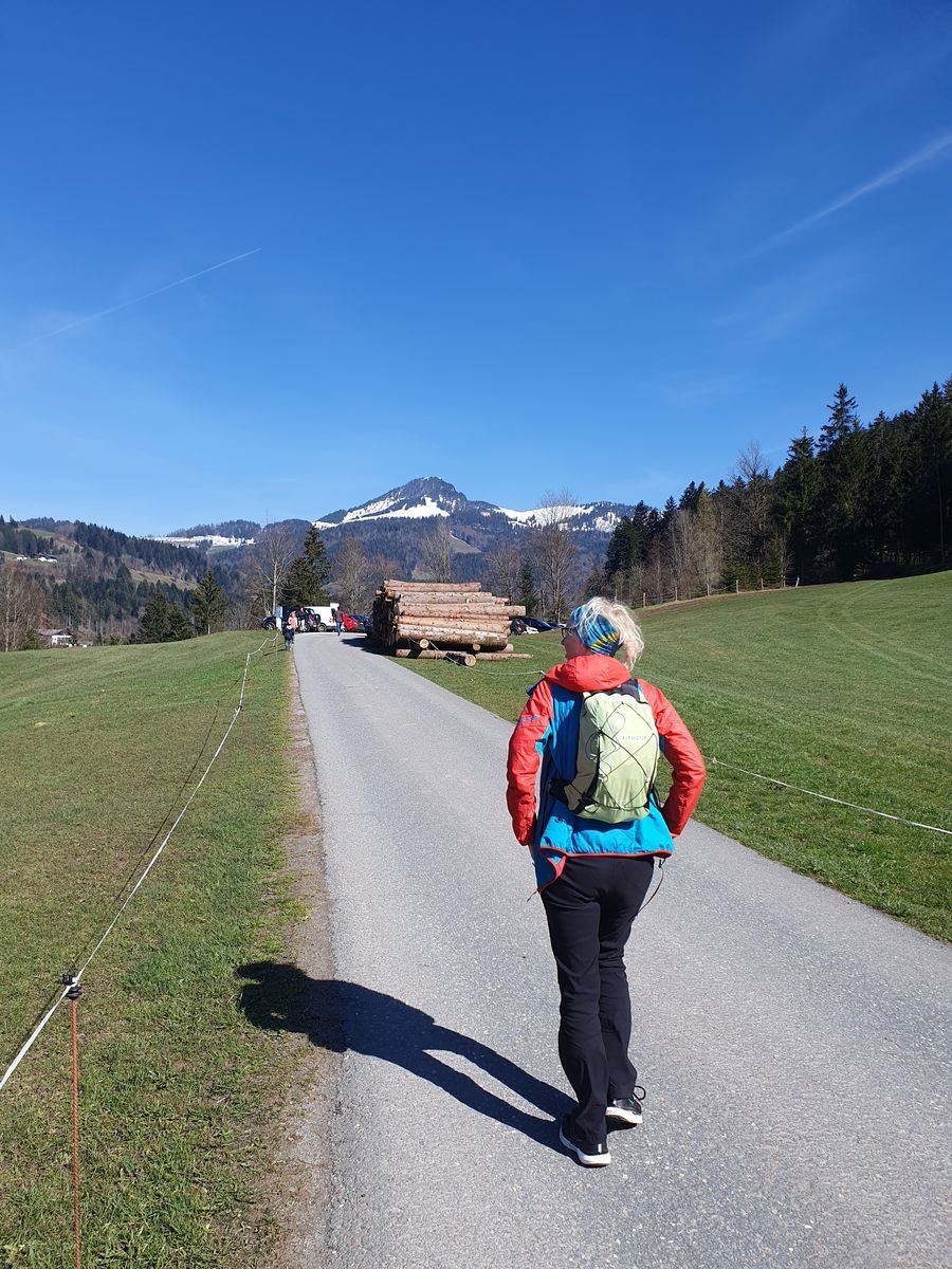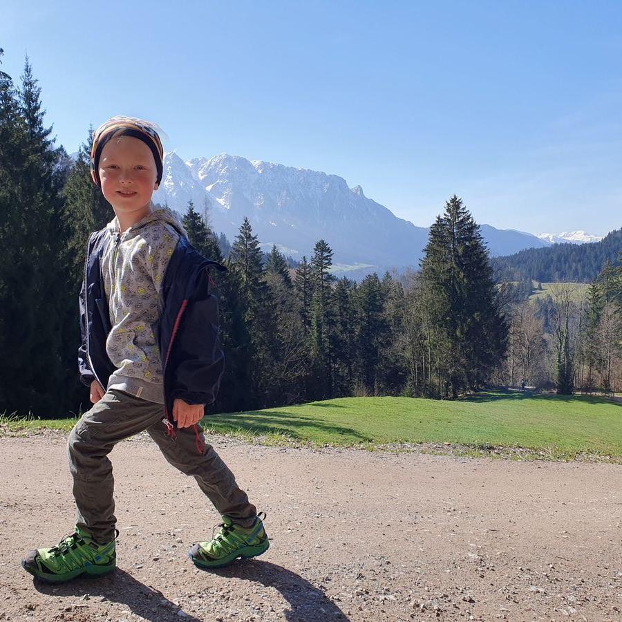 Wir wanderten vom gut gefüllten Wanderparkplatz Wildbichler Alm eine Forststraße nach oben. Viele weitere Wanderer waren unterwegs. Wir fanden einen Geocache, einen Baum zum Kraxeln und den ein oder anderen Trail als Abkürzung. Wir hatten viel Spaß beim Aufstieg und vor der Einkehr in der Wildbichler Alm sollte auch ein Gipfelsieg her. Wir entschieden uns für einen kleinen Trail, der kurz nach der Hütte rechts abzweigt. Teilweise war es dort ziemlich abschüssig und vereist. Timi bekam es etwas mit der Angst zu tun, so dass Brigitte mit ihm zur Hütte abstieg.