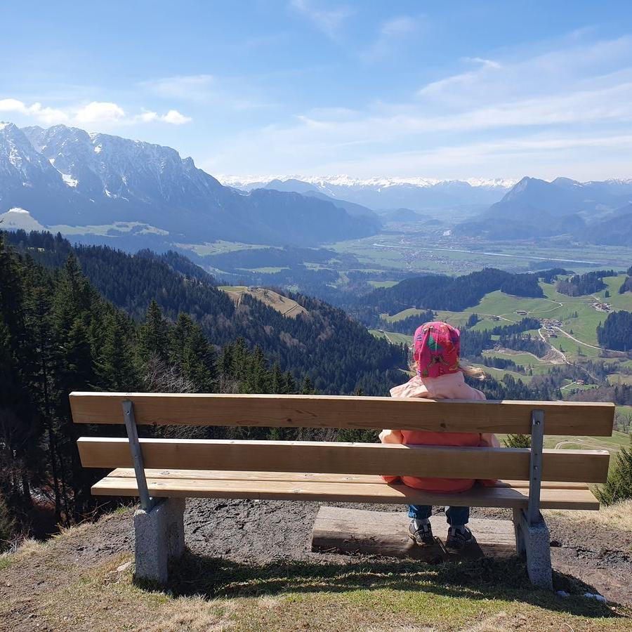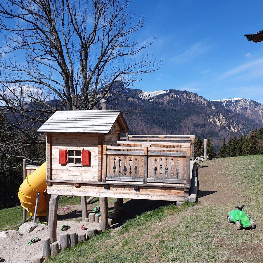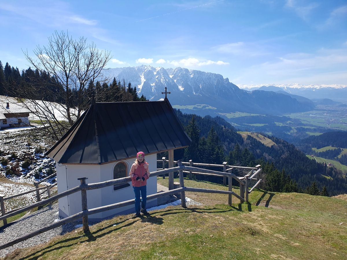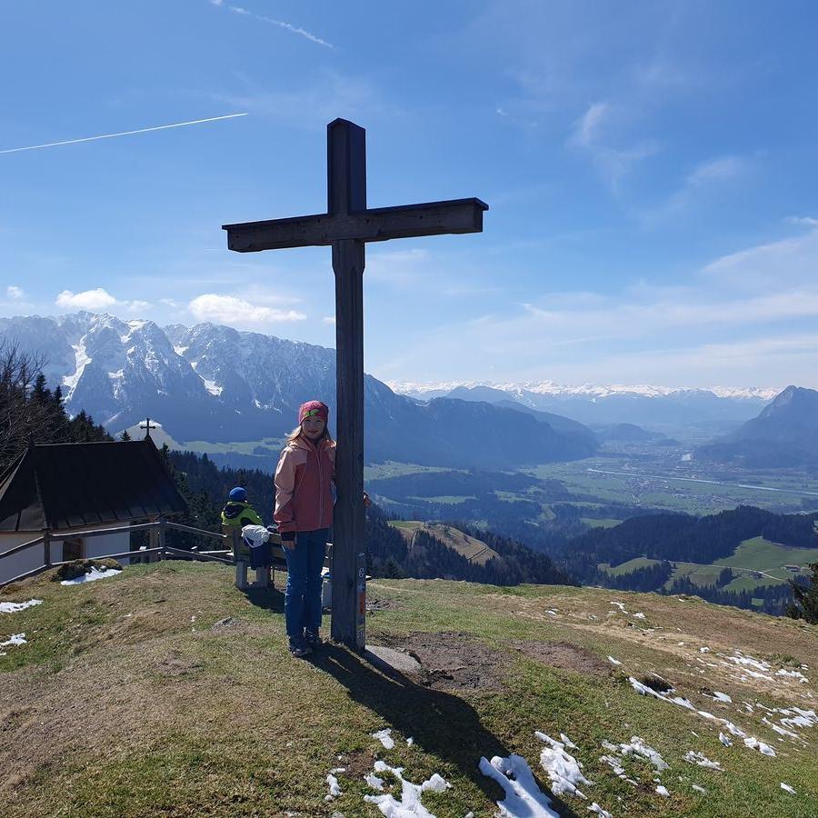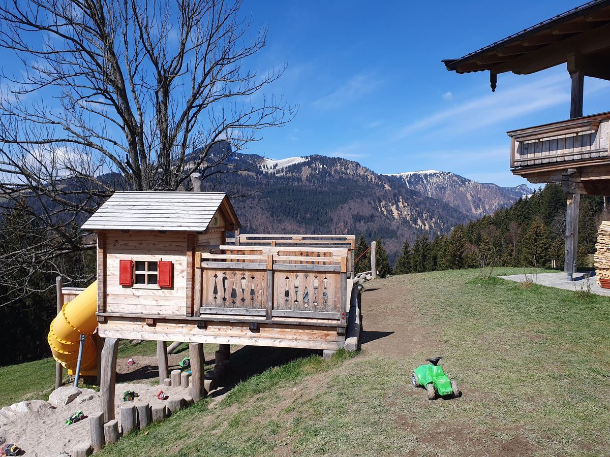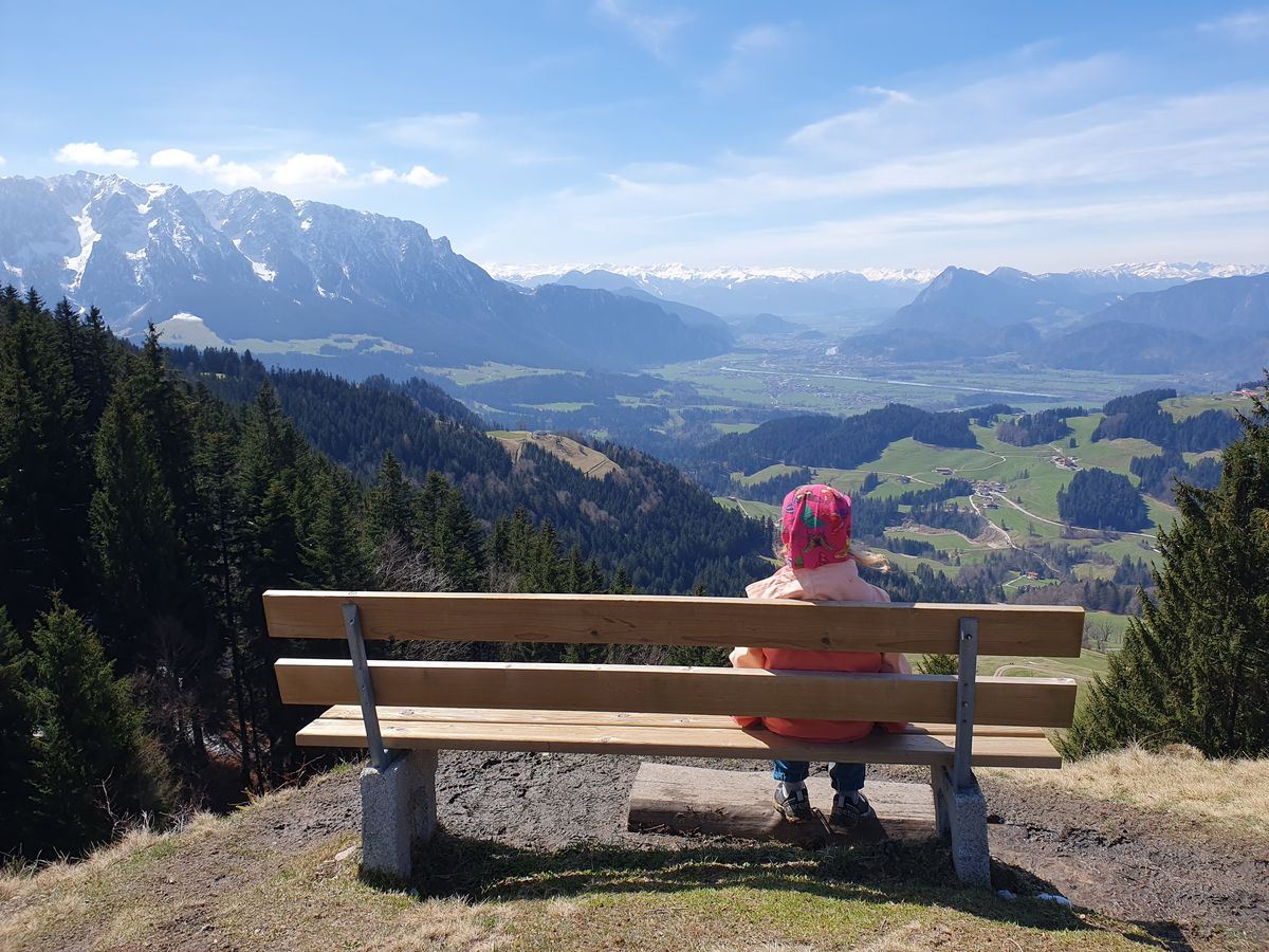 Emma und ich kämpften uns weiter nach oben und nach insgesamt 1 h und 45 min standen wir auf dem Gipfel der Karspitze. Wir genossen die Aussicht von einer kleinen Bank unterhalb des Gipfelkreuzes auf das Inntal, Wendelstein, Rofan und Zahmen Kaiser. Auch einen Geocache suchten wir am Gipfel. Zurück zur Hütte wählten wir den einfacheren Forstweg. In der Hütte warteten schon Timi und Brigitte auf uns. Die Kinder hatten große Freude am schönen Hüttenspielplatz.