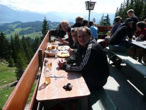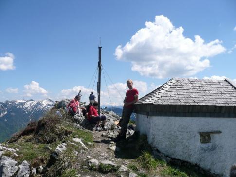 Schon um halb 10 startete unsere Wanderung am Wanderparkplatz Sachrang bei herrlichem Frühjahrswetter. Mit dabei waren diesmal Robert, Christine und Lenker. Zuerst wanderten wir über die Teerstraße nach Sachrang und bogen dann an der Kirche nach links ab, Richtung Mesneralm. Es ging am Anfang durch den Wald relativ steil nach oben, bis wir nach ca. 1 Stunde die Mesneralm erreichten. Von hier hatte man schon den ersten schönen Ausblick Richtung Kaisergebirge. Als erstes machten wir Brotzeit. bevor es uns zuerst nochmals steil durch den Wald und später über Almwiesen weiter nach oben führte. Nach einer dreiviertel Stunde sahen wir das Spitzsteinhaus. Der Weg schlängelte sich daran vorbei, Richtung Spitzsteingipfel. Leicht außer Atem und etwas ins Schwitzen gekommen, standen wir 5 Gipfelstürmer nach ca. einer weiteren Stunde, auf dem Gipfel des Spitzsteins. Eine kleine Kapelle und ein Gipfelkreuz schmückten den Berg. Von hier konnten wir weit in die Alpenlandschaft blicken. Vor dem Abstieg sonnten wir uns und machten Rast. Auf dem Weg ins Tal kehrten wir im Spitzsteinhaus ein, wo es was deftiges zum Mittagessen gab. Der weitere Abstieg führte uns über Mitterleiten wieder zurück ins Tal. Wohlbehalten kamen wir dann am Spätnachmittag wieder am Parkplatz an. Alle haben die 850 Höhenmeter ohne größere Probleme überstanden. Auf der Heimfahrt hielten wir noch kurz am Chiemsee, bevor wir uns endgültig auf den Nachhauseweg machten.