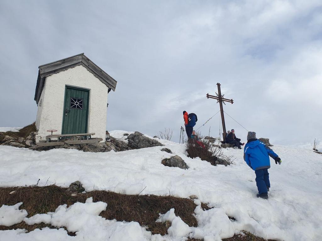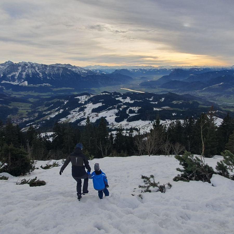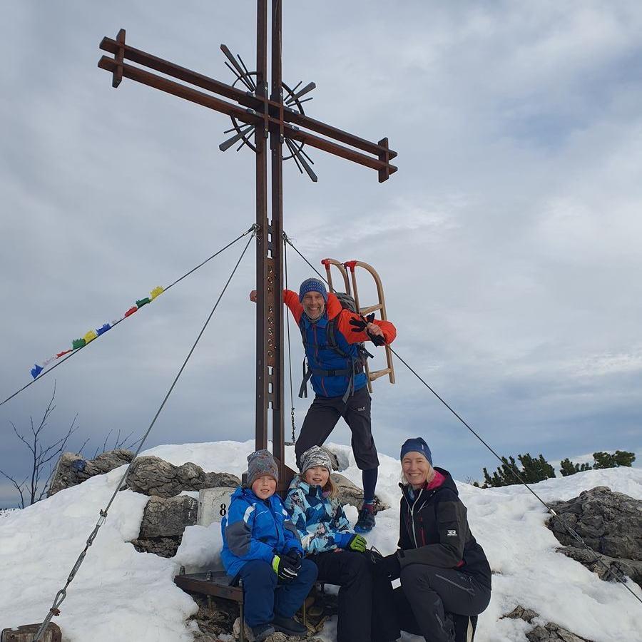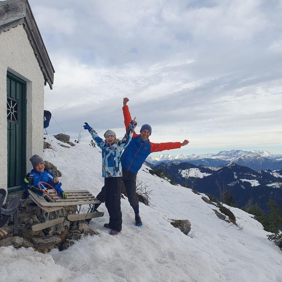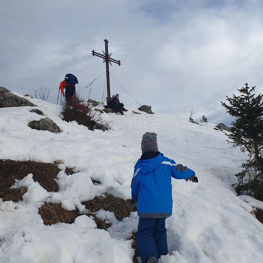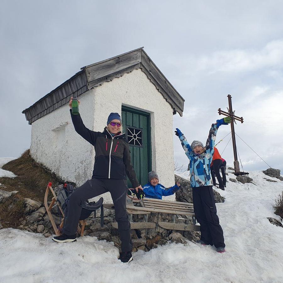 Am Wanderparkplatz Erlerberg lag einiges an Schnee, so dass wir uns entschieden, den Schlitten an den Rucksack zu packen. Wir wanderten vorbei an der Stoana Alm über verschneite Almwiesen bis zum Spitzsteinhaus. In der darüber liegenden Altkaser Alm machten wir Rast und stärkten uns mit Suppe und Schorle. Von hier ist es noch ca. 1 Stunde bis zum Spitzsteingipfel. Timi und Emma waren motiviert, somit entschieden wir uns, den Aufstieg zu versuchen. Durch den rutschigen Schnee kämpften wir uns den steilen Hang immer weiter nach oben. Teilweise krabbelten wir auf allen Vieren, um nicht abzurutschen. Das Abenteuer machte allen riesigen Spaß. Der Gipfel war in erreichbarer Nähe und die Mäuse ließen sich den Sieg nicht mehr nehmen. Stolz standen wir nach knapp 700 Höhenmetern und 2 1/2 Stunden Anstieg auf dem 1596 m hohen Spitzstein mit einer traumhaften Aussicht auf das Kaisergebirge.