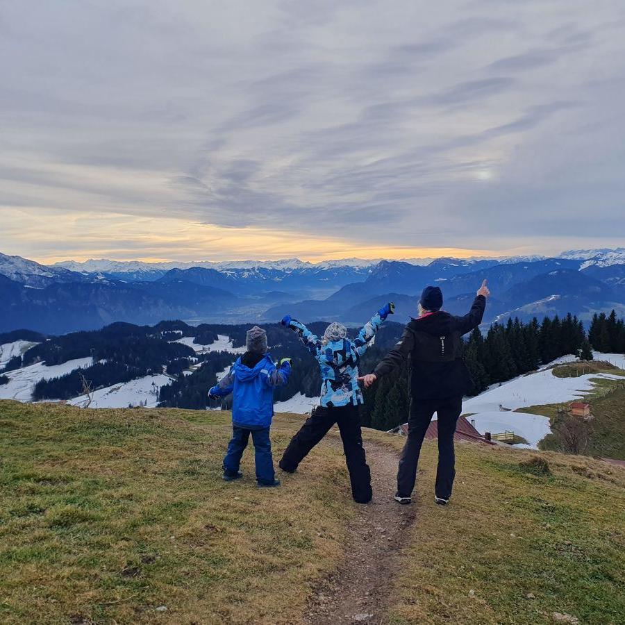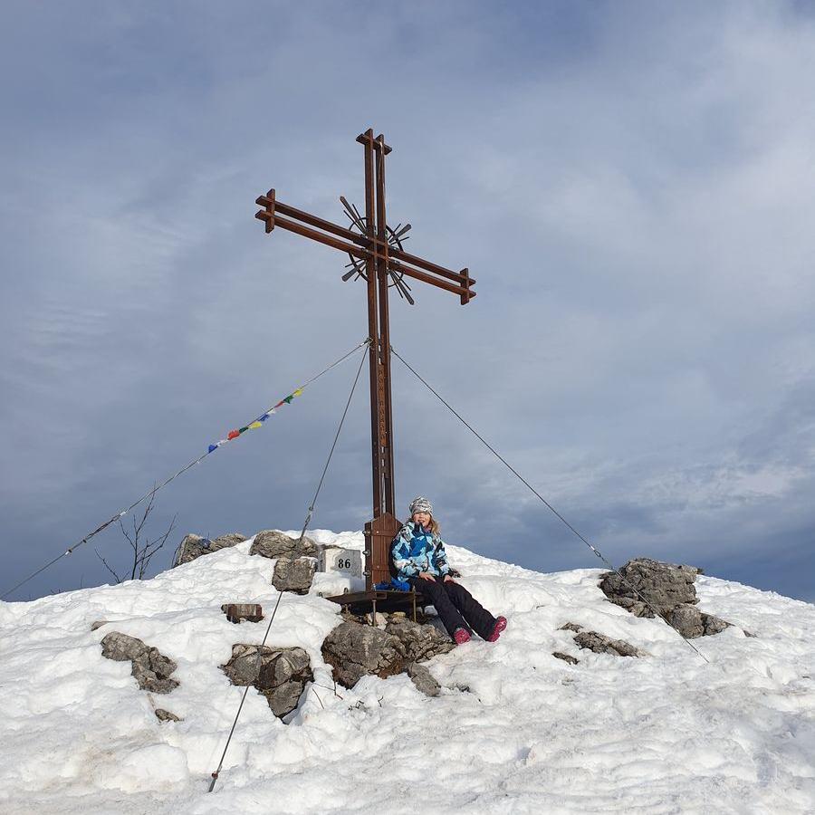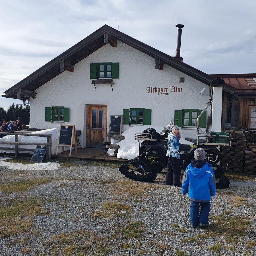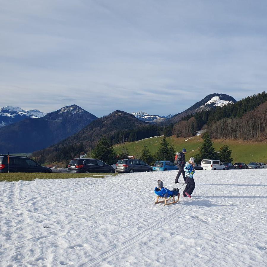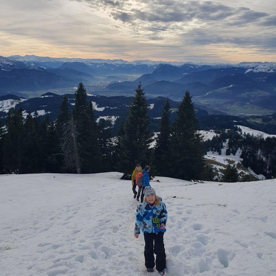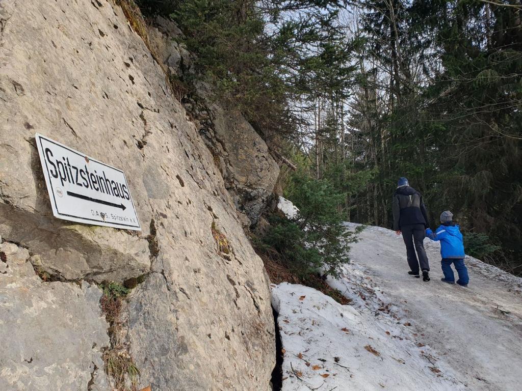 Am Wanderparkplatz Erlerberg lag einiges an Schnee, so dass wir uns entschieden, den Schlitten an den Rucksack zu packen. Wir wanderten vorbei an der Stoana Alm über verschneite Almwiesen bis zum Spitzsteinhaus. In der darüber liegenden Altkaser Alm machten wir Rast und stärkten uns mit Suppe und Schorle. Von hier ist es noch ca. 1 Stunde bis zum Spitzsteingipfel. Timi und Emma waren motiviert, somit entschieden wir uns, den Aufstieg zu versuchen. Durch den rutschigen Schnee kämpften wir uns den steilen Hang immer weiter nach oben. Teilweise krabbelten wir auf allen Vieren, um nicht abzurutschen. Das Abenteuer machte allen riesigen Spaß. Der Gipfel war in erreichbarer Nähe und die Mäuse ließen sich den Sieg nicht mehr nehmen. Stolz standen wir nach knapp 700 Höhenmetern und 2 1/2 Stunden Anstieg auf dem 1596 m hohen Spitzstein mit einer traumhaften Aussicht auf das Kaisergebirge.