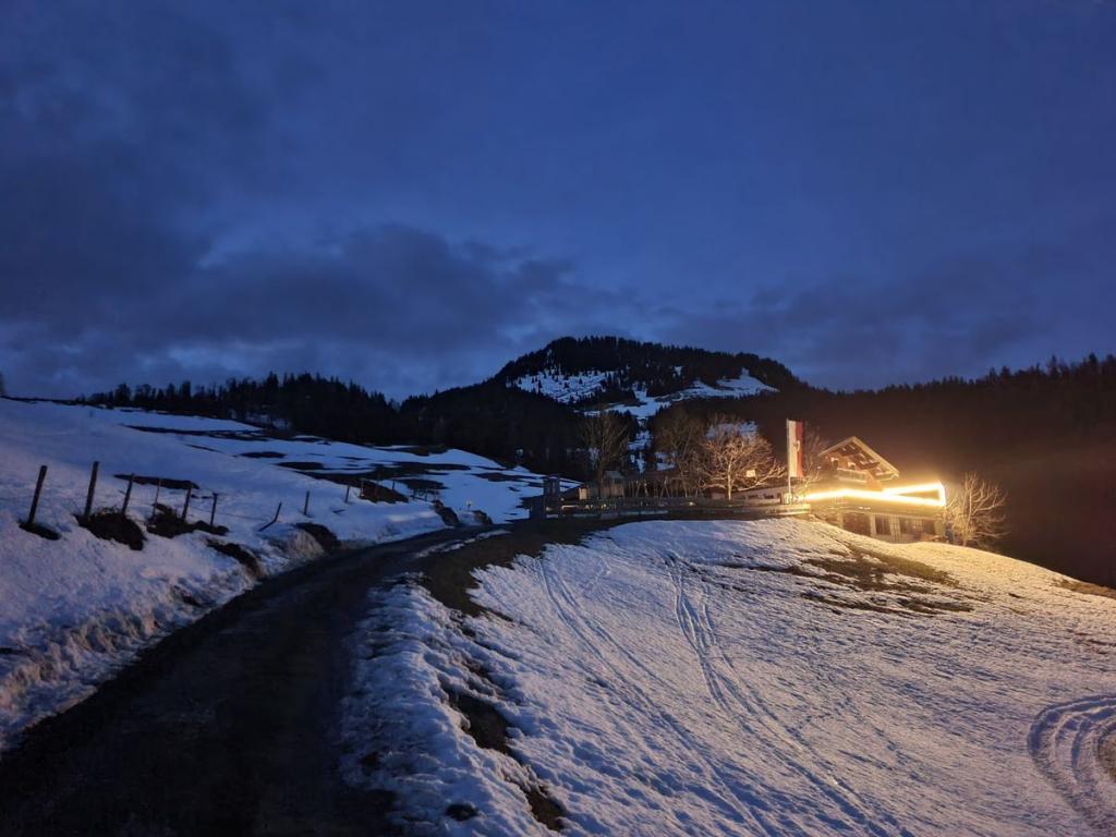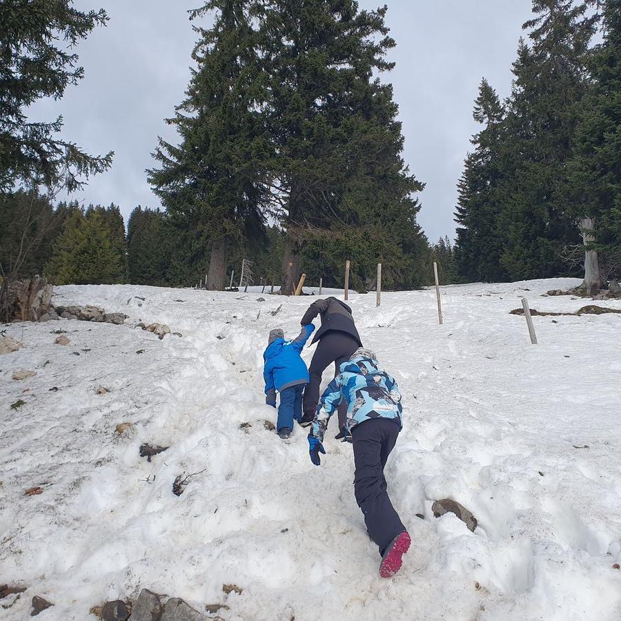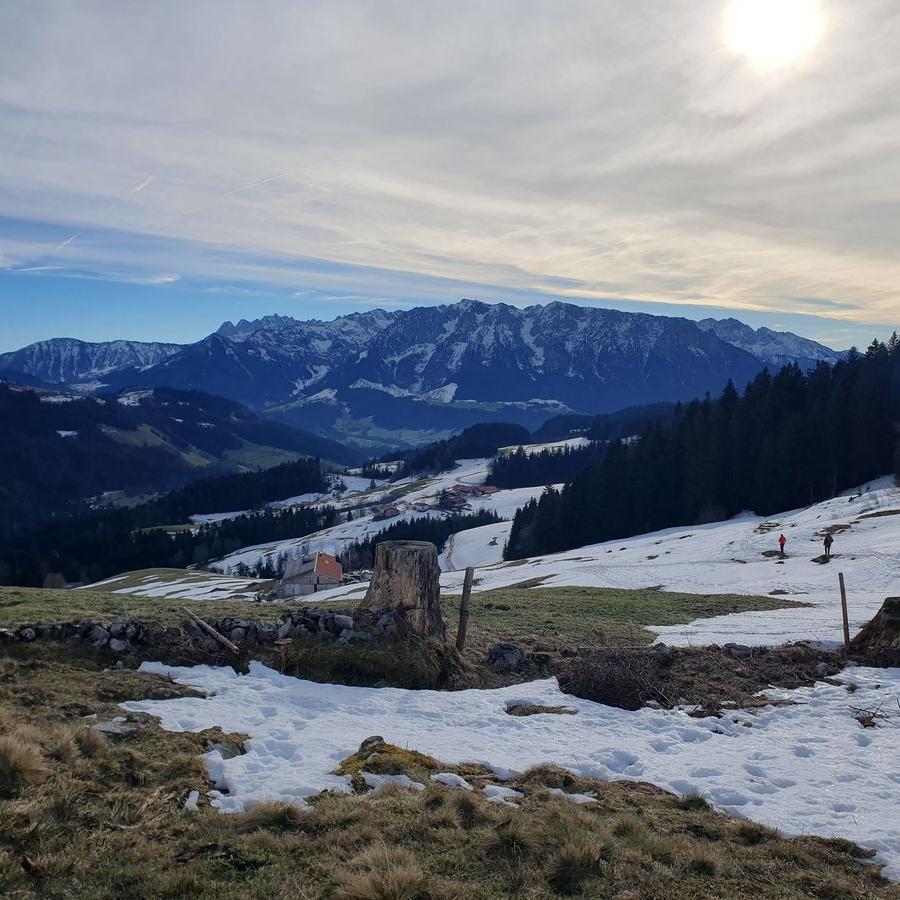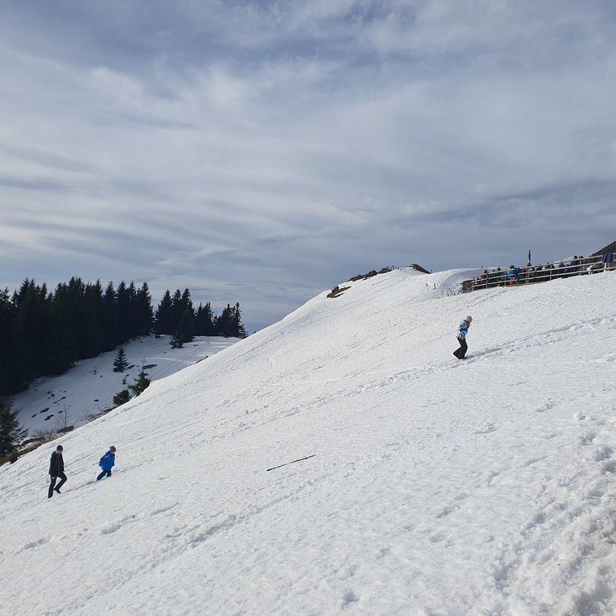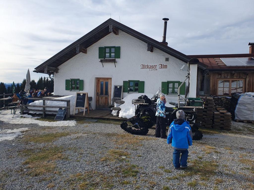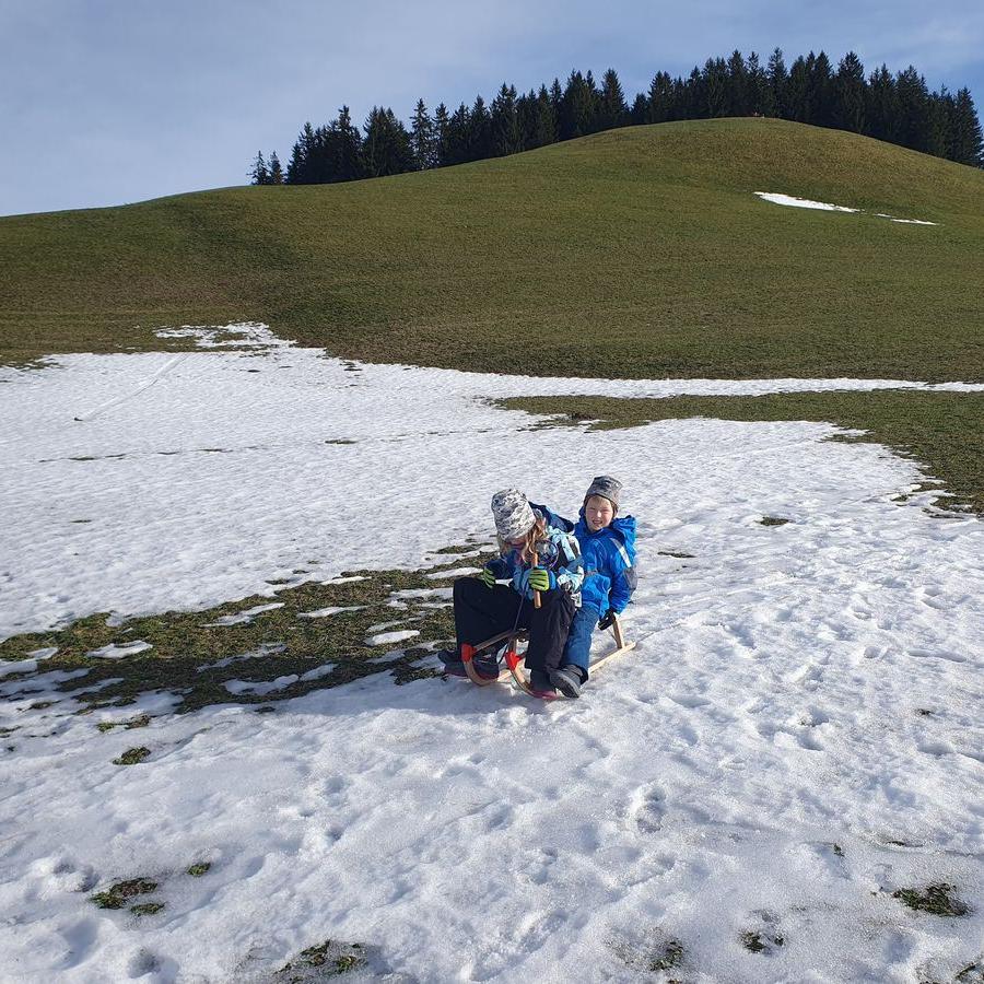 Am Wanderparkplatz Erlerberg lag einiges an Schnee, so dass wir uns entschieden, den Schlitten an den Rucksack zu packen. Wir wanderten vorbei an der Stoana Alm über verschneite Almwiesen bis zum Spitzsteinhaus. In der darüber liegenden Altkaser Alm machten wir Rast und stärkten uns mit Suppe und Schorle. Von hier ist es noch ca. 1 Stunde bis zum Spitzsteingipfel. Timi und Emma waren motiviert, somit entschieden wir uns, den Aufstieg zu versuchen. Durch den rutschigen Schnee kämpften wir uns den steilen Hang immer weiter nach oben. Teilweise krabbelten wir auf allen Vieren, um nicht abzurutschen. Das Abenteuer machte allen riesigen Spaß. Der Gipfel war in erreichbarer Nähe und die Mäuse ließen sich den Sieg nicht mehr nehmen. Stolz standen wir nach knapp 700 Höhenmetern und 2 1/2 Stunden Anstieg auf dem 1596 m hohen Spitzstein mit einer traumhaften Aussicht auf das Kaisergebirge.