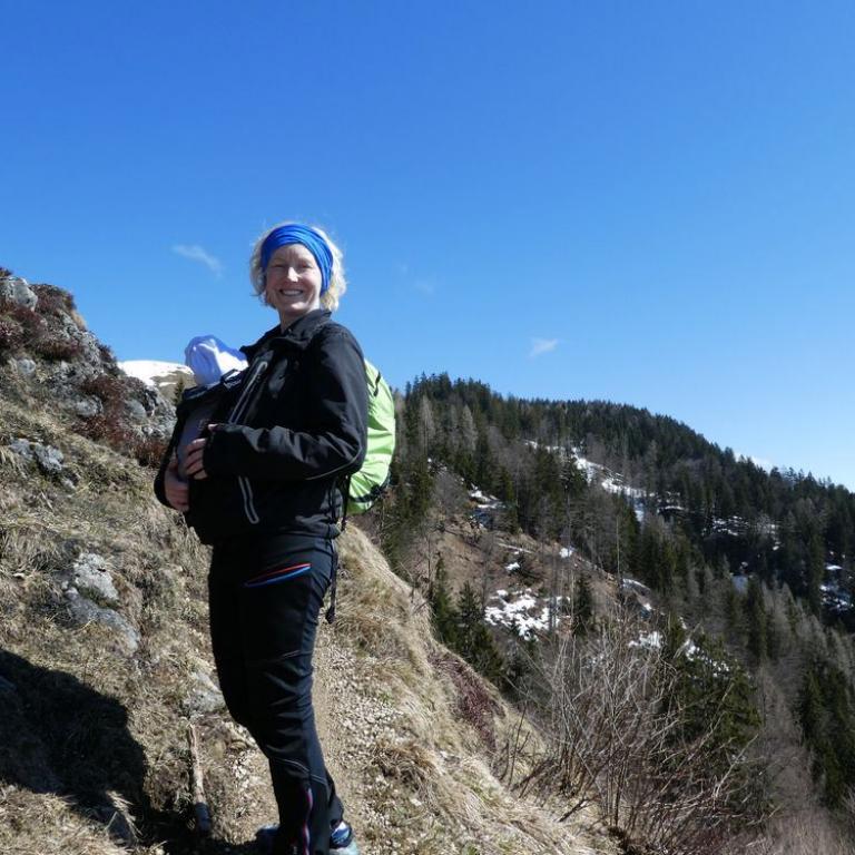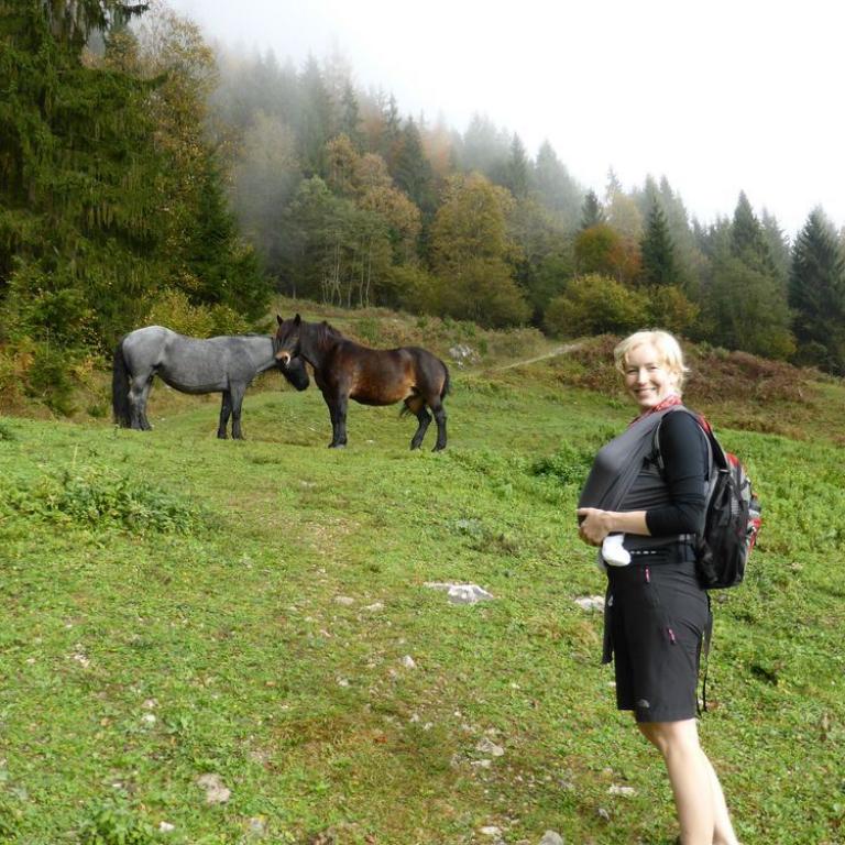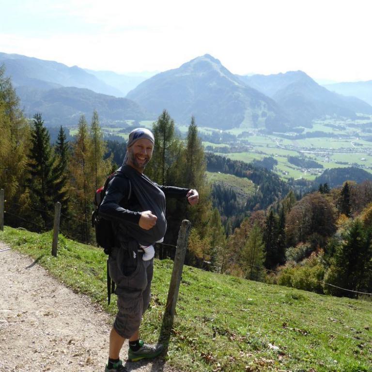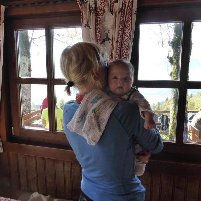 Auch heute mussten wir einfach zum Wandern gehen. Das Wetter sollte wieder herrlich werden und das mussten wir ausnutzen. Wir fuhren von Grassau nach Kössen, wo wir kurz vorher nach links in eine kleine Straße einbogen und das Auto am Waldrand abstellten. Ein Schild mit der Aufschrift "Taubenseehütte geöffnet" begrüßte uns schon und los ging es mit Emma im Tragetuch. Zuerst wanderten wir auf einem Forstweg, der später in einen Steig mündete. Wir kamen über Almwiesen mit Pferden und kleinen Almen. Je höher wir kamen desto besser wurde die Aussicht auf das Kaisergebirge. Ab der Moosenhütte führte uns ein herrlicher Steig steil nach oben bis zur Taubenseehütte auf 1165 m. Hier waren wir um 11 Uhr die ersten Gäste. Unsere kleine Maus hatte gleich mal Hunger, wie auch die Eltern. Es gab Radler und Gulasch mit Nudeln. Später wanderten wir noch zum 10 min entfernten Taubensee, bevor wir wieder über einen Forstweg abstiegen.