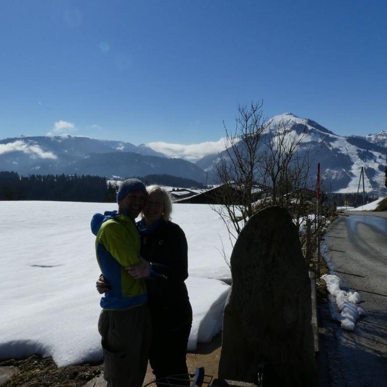 Das schöne Wetter mussten wir ausnutzen. Und da bot sich natürlich die Taubenseehütte bei Kössen an. Wir packten nach dem Frühstück die Kinder ins Auto um zum Wandern zu fahren. Bei Mühlberg, oberhalb Kössens parkten wir unser Auto am kostenpflichtigen Wanderparkplatz auf einem Bauernhof. Emma und auch Timi schliefen während der 30 minütigen Fahrt ein. Brigitte übernahm Timi und Emma ging zuerst noch selber. Wir stapften durch den Schnee einen Forstweg nach oben. Als es steiler wurde, durfte Emma auf meine Schulter. Bei einer Alm führte uns der Weg durch den Schnee zu einem steilen Pfad. Hier kämpften wir uns nach oben. Die Sonne war so stark, das uns der Schweiß von der Stirn tropfte. Nach 1 1/2 Stunden und knapp 400 Höhenmetern Aufstieg erreichten wir die gut besuchte Taubenseehütte. Hier hatten wir eine traumhafte Aussicht auf den Wilden und Zahmen Kaiser. Einfach nur schön. Wir ließen uns Weißbier, Schorle, Schnitzel, Kaiserschmarrn und Timi seine Milch, schmecken, bevor wir über eine schneebedeckte, steile Forststraße nach unten rutschten. Emma und ich liefen was das Zeug hielt. Immer wieder landeten wir im Schnee und waren patsch nass. Da es so warm war, machte uns das aber nichts aus. Nach insgesamt 2 1/2 Stunden Wanderung erreichten wir wieder den Parkplatz. Kaputt schliefen unsere Zwerg sofort im Auto ein...