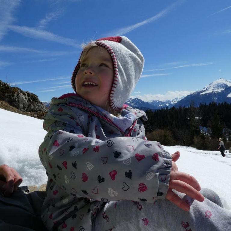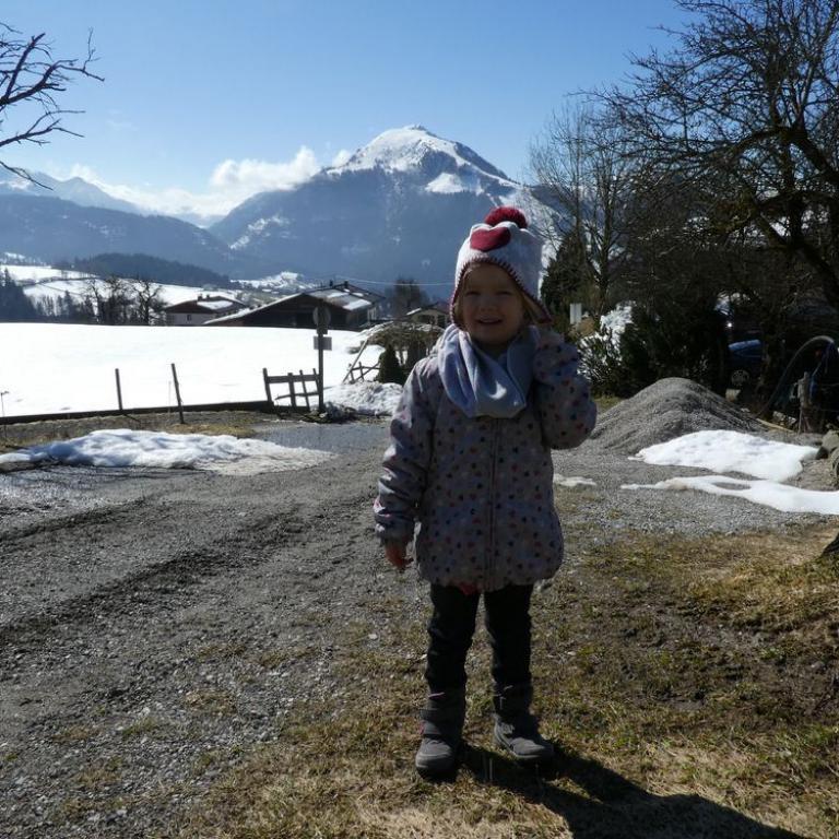 Eigentlich wollten wir schon früh nach Hause fahren, aber das schöne Bergwetter ließ uns nicht los. Nachdem wir unsere Siebensachen im Auto verstaut hatten fuhren wir nach Kössen, wo schon einiges an Schnee lag. Von hier fuhren wir zum gebührenpflichtigen Wanderparkplatz Mühlberg. Das Panorama war wie immer traumhaft. Vor uns der Wilde und Zahme Kaiser, die Loferer Steinberge und auch der Watzmann war zu sehen. Es lag Schnee und auch die Wege waren teilweise vereist, aber der Aufstieg machte trotzdem oder gerade deswegen Spaß. Unsere kleine Maus war zuerst nicht so begeistert, aber als wir uns dann ab der Moosenhütte auf einem Kraxelsteig nach oben kämpften, war Emma in ihrem Element :-) Nach ca. 1 Stunden erreichten wir die traumhaft gelegene Hütte bei Sonne und herrlicher Aussicht. Wir wanderten noch kurz zum Taubensee, der aber im Schatten lag und zugeschneit war. In der gefüllten Hütte kauften wir uns eine leckere Brotzeit, bevor wir auf dem Normalweg nach unten sausten. Emma und ich liefen und übten Sprünge in den Schnee und hatten dabei riesig Spaß, auch wenn wir ziemlich nass wurden. Nach der 3 Stunden Wanderung machten wir uns auf den Heimweg und konnten noch den Sonnenuntergang in den Bergen genießen.