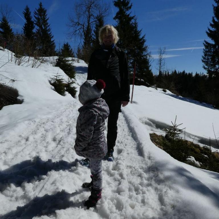Was soll man sagen, auch den 30. Dezember mussten wir ausnutzen. Das Wetter war wieder herrlich. Blauer Himmel, Sonnenschein und leichte Plusgrade. Also fuhren wir von Grassau nach Kössen, nachdem wir unsere Sachen ins Auto gepackt hatten. Nach der Wanderung wollten wir leider wieder nach 5 herrlichen Tagen in Grassau die Heimreise antreten. In Kössen suchten wir in der Nähe der Kirche die Auffahrt zum Mühlberg, wo wir an einem privatem Wanderparkplatz für 2 Euro unser Auto abstellten. Emma durfte in die Kraxn und gleich ging es auch steil nach oben. Uns wurde ganz schön warm in der Sonne. Wir wanderten über Almwege, kleine Forststraßen und einem steilen Steig bis zur Sauermöseralm auf 1279 m. Hier genossen wir Aussicht und Sonne. Auf einem weiteren Steig gelangten wir dann bis zum vereisten und im Schatten liegendem Taubensee. Nur ein paar Meter weiter liegt die viel besuchte und gemütliche Taubenseehütte auf 1165 m. Emma unterhielt wieder die gesamte Hütte. Wir genossen eine deftige Brotzeit, Bier und einen Schnaps :-) Ins Tal durfte Emma dann selbst gehen, was immer besser funktioniert. Am späten Nachmittag erreichten wir dann unseren Parkplatz und traten die Heimreise an.