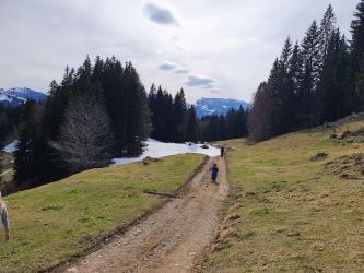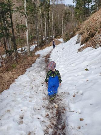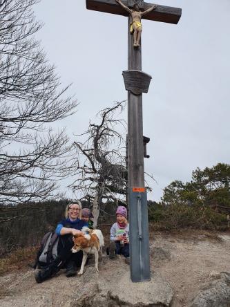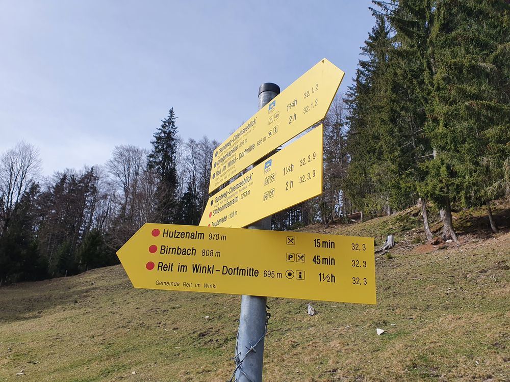 Wir starteten die Wanderung am kleinen Wanderparkplatz am Ende von Birnbach. Hier sind nur begrenzt Wanderparkplätze vorhanden (ca. 10-15). Zuerst führt eine kleine Teerstraße in Serpentinen nach oben. Nach ca. 30 Minuten gelangt man an einen Abzweiger nach rechts. Wenn man auf der Teerstraße bleibt erreicht man nach ca. 200 m die bewirtschaftete Hutzenalm. Wir aber bogen in den kleinen Steig mit der Markierung "Rundweg Chiemseeblick/Hutzenalm" ab. Der Wegweiser zeigt zum Wetterkreuz 50 min. Zuerst überquert man einen kleinen Bach und gelangt durch ein Gatter. Auf einem wurzeligen und steinigen Pfad geht es leicht ansteigend weiter. Immer wieder ist das Gelände leicht abschüssig, wo Trittsicherheit unbedingt erforderlich ist. Nach ca. 1/2 Stunde überquert man Holzplanken über ein kleines Sumpfgebiet. Hier gelangt man auf eine kleine Forststraße die nach links zur Hutzenalm führt und nach rechts zum Gipfel. Nach einigen Metern endet die Forststraße bei einer Bank und ein weiterer alpiner, teilweise abschüssiger Steig schlängelt sich um den Berg. Auch hier ist wieder Trittsicherheit geboten. An einer weiteren Gabelung geht es nach rechts steil nach oben. Das Gipfelkreuz ist hier schon ersichtlich. Die letzten Meter sind mit einem Geländer gesichert und führen über Holzstufen, da es linkerhand steil nach unten geht. Nach ca. 1 1/2 Stunden und ca. 350 Höhenmetern standen wir auf dem Gipfel des Wetterkreuzes mit seinen 1061 m. Drei Bänke laden zur Brotzeit ein. Wir machten es uns aber hinter dem Gipfelkreuz auf dem Boden bequem und genossen die herrliche Aussicht auf Reit im Winkl, das Fellhorn, die Kitzbüheler Alpen, Unterberghorn und den Wilden und Zahmen Kaiser. Am Gipfel findet man als Bonus für die Kinder einen kleinen Geocache. Der Abstieg erfolgt über den Aufstiegsweg. Dieses Mal blieben wir aber an der Abzweigung zu den Holzplanken über den Sumpf auf der Forststraße. Auf dieser wanderten wir bis zur Hutzenalm. An der Alm geht es vorbei bis zur kleinen Teerstraße. Diese führt wieder zum Ausgangspunkt am Wanderparkplatz Birnbach zurück. Die Wanderung dauert ca. 2 3/4 Stunden bei 400 Höhenmetern und 7 Kilometern.