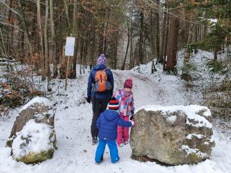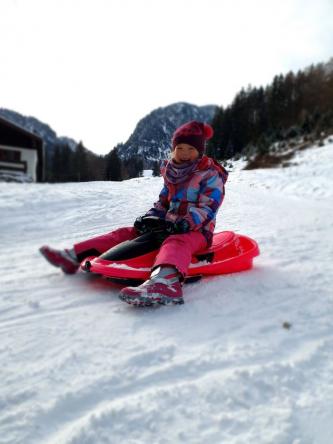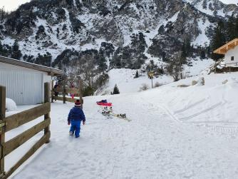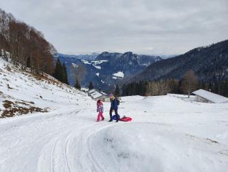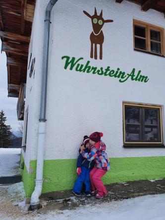 Unsere Wanderung zur Wuhrsteinalm in den Chiemgauer Alpen startete am Parkplatz Geigelsteinbahn. Vorbei an den Informationstafeln ging es in den Wald und über eine kleine Brücke die über einen Wildbach führt. Nach ein paar hundert Metern gelangten wir auf eine Almstraße mit der Beschilderung Wuhrsteinalm. Gleichzeitig war dies auch die Rodelbahn im Winter. Ich zog die Kinder teilweise mit dem Schlitten nach oben, aber die meiste Zeit trug ich Timi auf der Schulter und Emma ging selbst. Der Weg war ziemlich glatt und Grödel wären nicht schlecht gewesen. Nach knapp über 1 Stunde erreichten wir ein Almgebiet und die Bergstation der Geigelsteinbahn. Hier waren wir im Winterwonderland angekommen. Im Frühling blühen hier Alpenglöckchen und Frühlingsenzian. Auch Alpenrosen und Almenrausch oder Steinrose genannt sind hier von Ende Mai bis Juli anzutreffen. Wir marschierten über die Almfläche auf dem verschneitem Forstweg weiter nach oben, bis zur letzten Alm, der Wuhrsteinalm. Vor uns liegt der Geigelstein und Breitenstein, zwei lohnende Skitouren und Wanderberge (Auf beiden waren wir schon im Sommer wie auch Winter). Bei der Alm gab Sitzgelegenheiten, auf denen wir unsere mitgebrachte Brotzeit genossen. Auf dem Aufstiegsweg sauste Emma und Brigitte mit dem Rodel in Richtung Tal. Timi traute der Sache zuerst nicht und ich lief mit ihm auf der Schulter nach unten. Erst weiter unten stieg auch Timi auf den Rodel um und hatte riesig Spaß zusammen mit mir zu fahren. Noch dreimal stiegen wir ein Stück auf und fuhren nochmals nach unten.