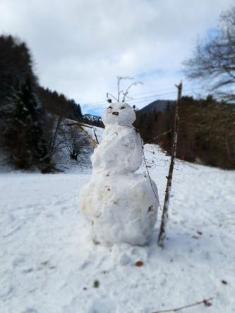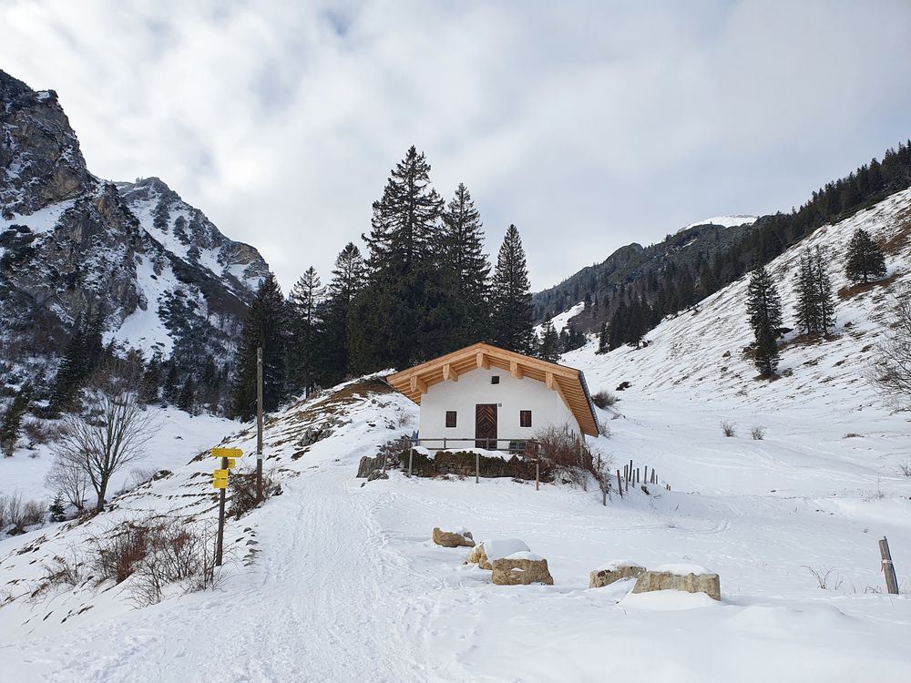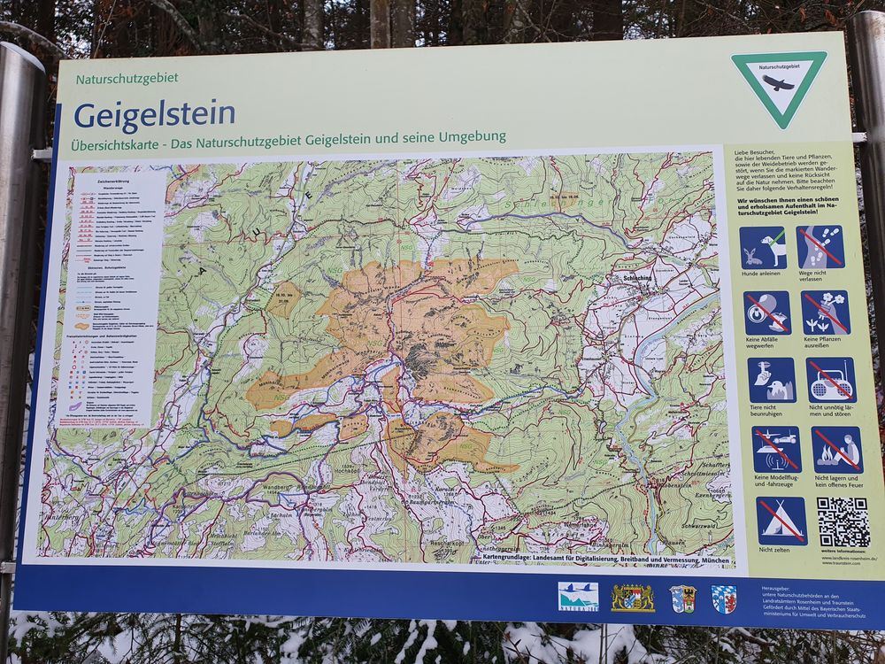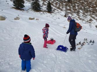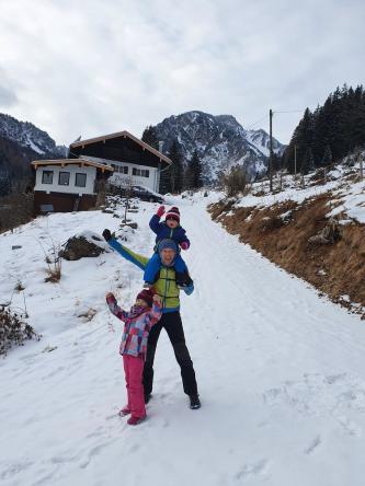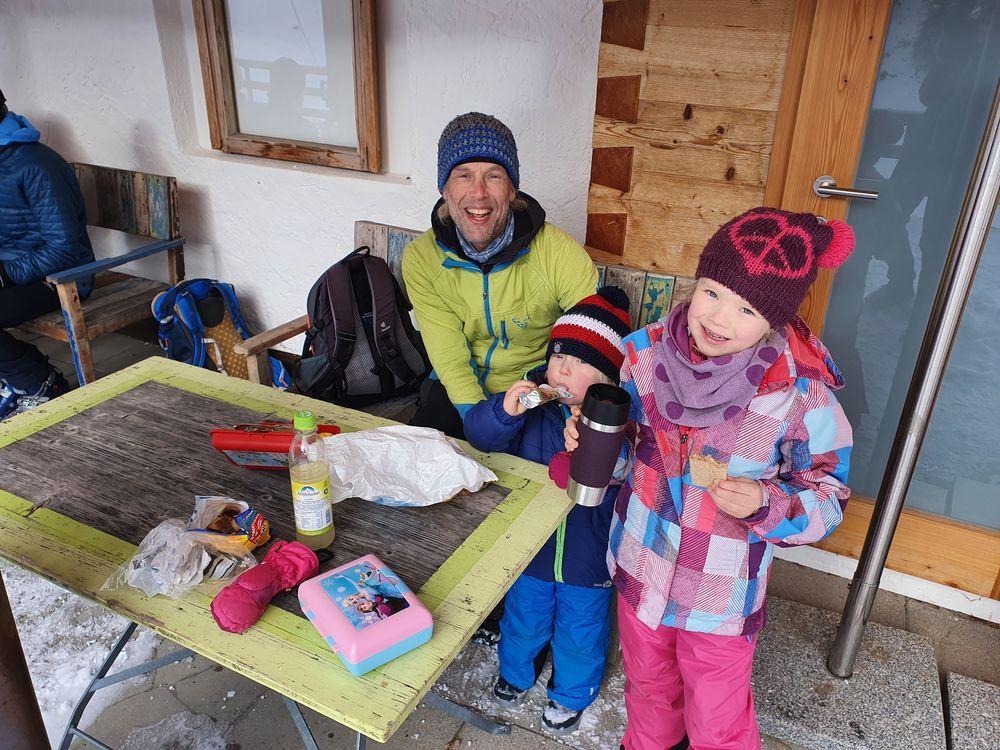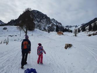 Unsere Wanderung zur Wuhrsteinalm in den Chiemgauer Alpen startete am Parkplatz Geigelsteinbahn. Vorbei an den Informationstafeln ging es in den Wald und über eine kleine Brücke die über einen Wildbach führt. Nach ein paar hundert Metern gelangten wir auf eine Almstraße mit der Beschilderung Wuhrsteinalm. Gleichzeitig war dies auch die Rodelbahn im Winter. Ich zog die Kinder teilweise mit dem Schlitten nach oben, aber die meiste Zeit trug ich Timi auf der Schulter und Emma ging selbst. Der Weg war ziemlich glatt und Grödel wären nicht schlecht gewesen. Nach knapp über 1 Stunde erreichten wir ein Almgebiet und die Bergstation der Geigelsteinbahn. Hier waren wir im Winterwonderland angekommen. Im Frühling blühen hier Alpenglöckchen und Frühlingsenzian. Auch Alpenrosen und Almenrausch oder Steinrose genannt sind hier von Ende Mai bis Juli anzutreffen. Wir marschierten über die Almfläche auf dem verschneitem Forstweg weiter nach oben, bis zur letzten Alm, der Wuhrsteinalm. Vor uns liegt der Geigelstein und Breitenstein, zwei lohnende Skitouren und Wanderberge (Auf beiden waren wir schon im Sommer wie auch Winter). Bei der Alm gab Sitzgelegenheiten, auf denen wir unsere mitgebrachte Brotzeit genossen. Auf dem Aufstiegsweg sauste Emma und Brigitte mit dem Rodel in Richtung Tal. Timi traute der Sache zuerst nicht und ich lief mit ihm auf der Schulter nach unten. Erst weiter unten stieg auch Timi auf den Rodel um und hatte riesig Spaß zusammen mit mir zu fahren. Noch dreimal stiegen wir ein Stück auf und fuhren nochmals nach unten.