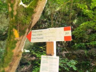Aufstieg: Direkt am Parkplatz gegenüber dem Hotel Ristorante Colomber startet die kleine Wanderung ins traumhafte Val di Sur bei San Michele. Man folgt dem Schild Rifugio G.Pirol auf dem Wanderweg 286. Zuerst wandert man auf einer kleinen Straße vorbei an Häusern mit blumenbewachsenen Gärten. Nach ein paar Metern mündet die Straße in einen ruppigen Forstweg. Immer wieder kommt man an Wiesen vorbei. An der rechten Seite befindet sich nach einiger Zeit ein Brunnen und etwas später ein Tunnel ins Nichts. Langsam steigt es moderat an und man wandert durch einen herrlich grünen Wald. Auf der linken Seite, unterhalb des Weges plätschert ein Bach. Rechts befindet sich ein kleiner Wasserfall, der direkt über den Weg in den Bach fließt und einen wildromantischen Charakter verleiht. Nach ca. 1 1/4 Stunden und 4 Kilometern erreicht man das Ende der Forststraße wo sich Parkmöglichkeiten und ein Wegweiser (Rfugio G.Pirlo 201) befinden. Die Fahrt mit dem Auto hierher ist sicherlich abenteuerlich. Ebenfalls befindet sich hier eine alte, moosbewachsene Mauer, auf die eine rostige Leiter führt. Dies ist das Ziel der Wanderung und man folgt zuerst dem Aufstiegsweg zurück. Natürlich kann man auch zum Rifugio oder sogar Monte Spino oder Monte Pizzocolo weiterwandern.