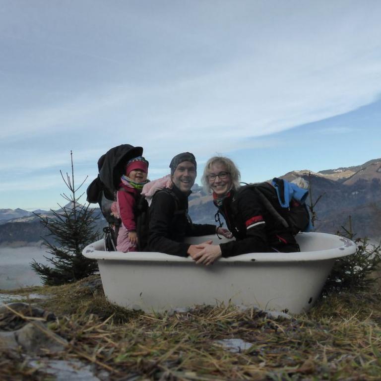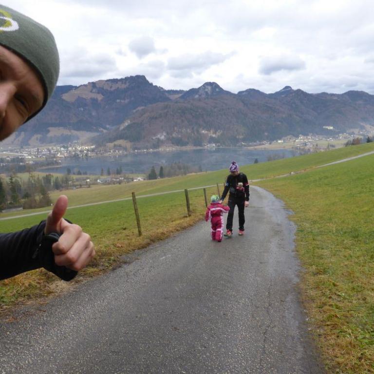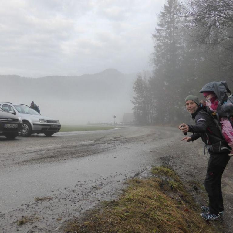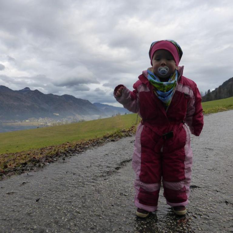 In Grassau war es ziemlich bewölkt, aber warm für die Jahreszeit. 7 Grad zeigte das Thermometer. Wir fuhren über Kössen zum Walchsee. Leider wurde es immer nebliger und kühler. In der Nähe des Campingplatzes führte uns eine kleine Straße zum Wanderparkplatz der Lippenalm. Emma durfte in die Kraxn und los konnte es gehen zuerst auf einer kleinen Teerstarße und später ziemlich vereisten Forststraße. Ich musste ganz schön aufpassen, damit die kleine Maus und ich nicht die Wiese runter kugelten :-) Wir gingen vorbei an der Lippenalm (961m) und hinauf zur Schwarzenbachalm und zum Ebersberg 1164 m. Hier schien die Sonne, es lag etwas Schnee und die Aussicht war herrlich auf den Zahmen Kaiser, gegenüber den Geigelstein und auch der Walchsee war durch den Nebel zu erkennen. Wir bauten einen kleinen Schneemann und stiegen dann zur Lippenalm auf dem Aufstiegsweg ab. Genau vor einem Jahr wanderten wir schon einmal zu dieser gemütlichen Alm. Wir aßen und tranken eine Kleinigkeit, bevor wir wieder zum Auto zurück wanderten und nach Grassau fuhren.
